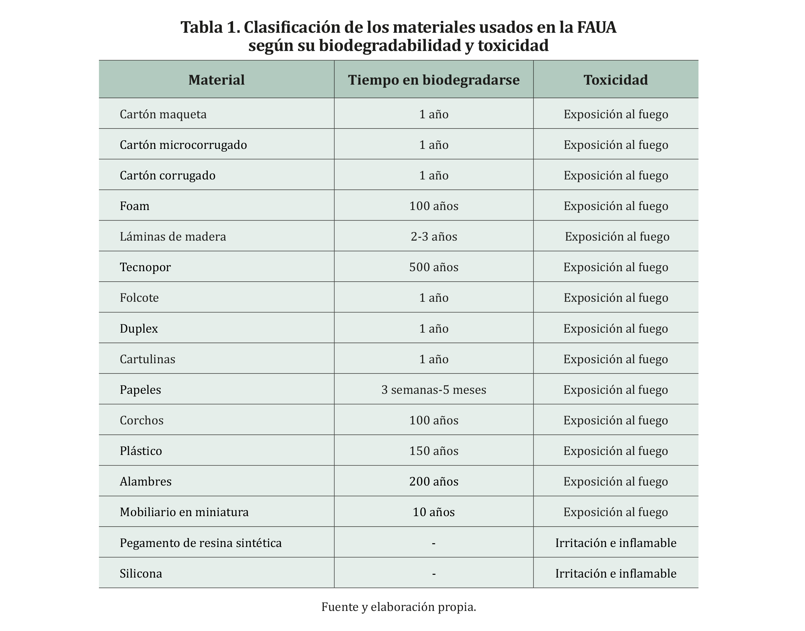 En la tabla 1 se presenta la lista de los 16 materiales más utilizados en la FAUA, conjuntamente con el tiempo que tardan en degradarse y el grado de toxicidad para aquellos que los manipulan.