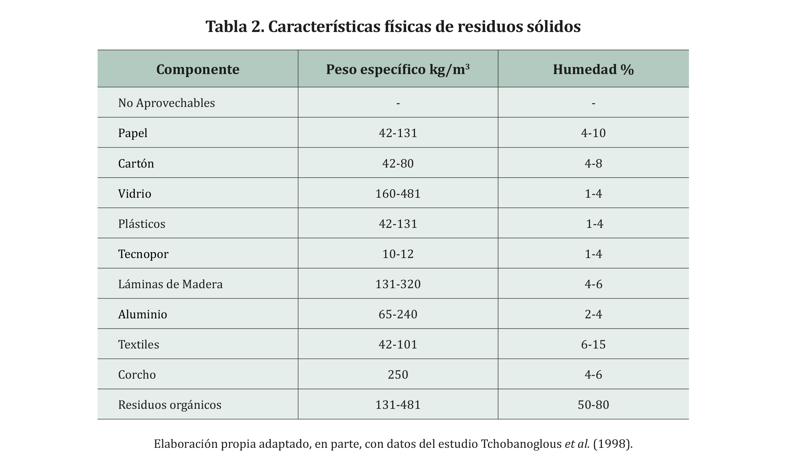 Aquí radica un grave problema, no solo por la exposición constante del alumnado y personal de limpieza a sufrir lesiones relacionadas a la incorrecta segregación en fuente, sino porque las propiedades de la materia prima de dichos residuos son afectadas por la humedad del residuo orgánico en descomposición, que tiende a unificarse (tabla 2). Por tanto, varios productos, como el papel o cartón, disminuyen su resistencia, modifican su estructura y pierden valor para su reciclaje (González et al., 2016); al contrario del tecnopor (poliestireno expandido), que es resistente al agua y aislante térmico. Sin embargo, en cualquiera de los casos, dichos materiales, al ser de baja densidad (10-42 kg/cm3), son voluminosos y ocupan mayor espacio en los contenedores de basura, así como en la unidad transportadora, lo que origina mayor gasto en su logística; hecho que podría evitarse si se clasifican previamente y se les brinda una opción de valorización dentro de la universidad.