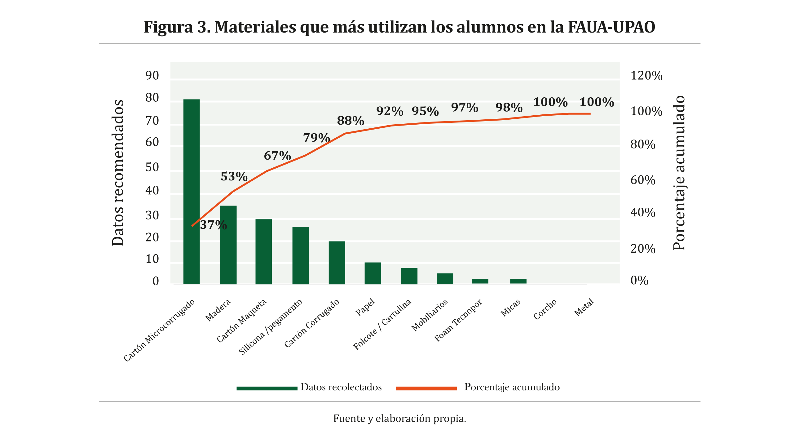 En cuanto la caracterización, se determinó que los insumos más utilizados son el cartón microcorrugado (37%), la madera (16%) y el cartón maqueta (14%), debido a la resistencia y rigidez de dichos materiales, los cuales tienen una humedad de 4.6% y una densidad que oscila entre 42-131 kg/m3. A su vez, la eliminación de papel y cartulina es alta, según el 27.52% de los estudiantes. La razón se debe a la cantidad de trabajos impresos que los docentes solicitan semanalmente. Todos los citados materiales podrían ser aprovechados para el reciclaje u otras actividades de reutilización.