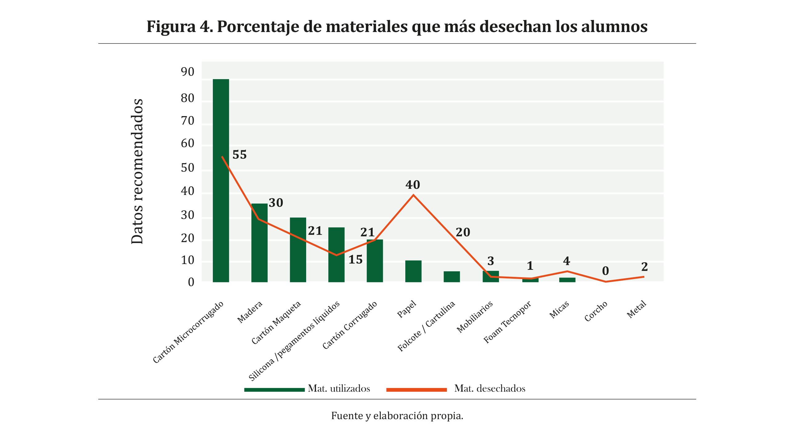 Por otro lado, de los 80 alumnos que utilizan cartón microcorrugado, solo 55 lo desechan; en el caso de las láminas de madera, solo 30 lo hace; y en el caso de cartón maqueta, solo 21. Esto se debe, principalmente, a la rigidez y consistencia de los 3 materiales que permiten su reutilización en otras actividades, ya sea para uso doméstico o para la fabricación de otras maquetas. A su vez, el precio de dichos insumos es bastante elevado y esto juega un papel importante en la decisión de los alumnos para conservarlos y reutilizarlos.