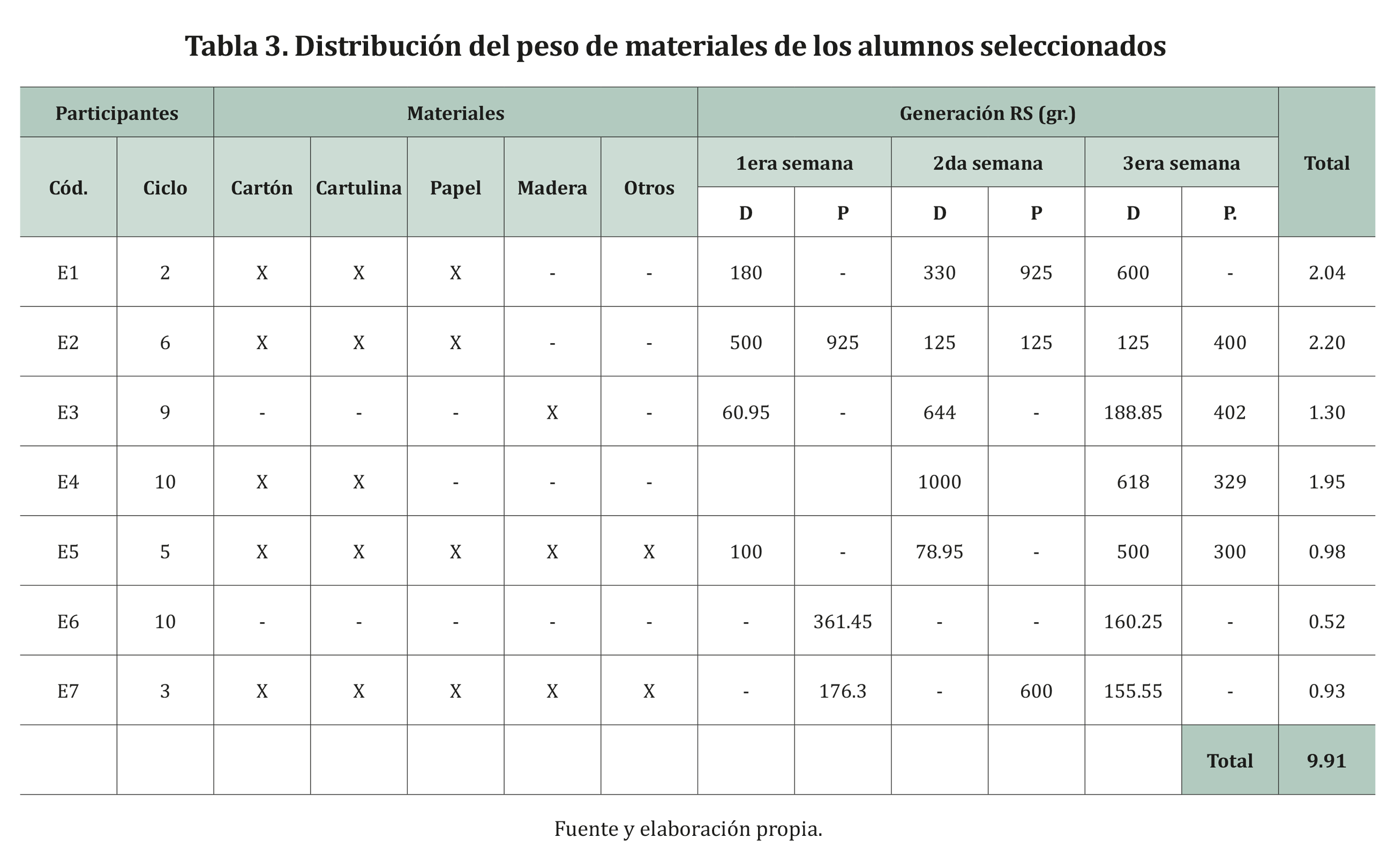 Para determinar la generación per cápita de desechos (GPC), se realizó un análisis de seguimiento a 7 alumnos durante el semestre 2019-02. Claramente, se trata de un trabajo empírico de aproximación que busca generar una primera idea de la cantidad de basura desechada, pero que no descarta la inclusión del método a posteriori mediante experiencias replicables, controladas y documentadas. En la tabla 3 se puede observar la distribución del peso de materiales por alumno seleccionado, cada uno con el código y ciclo al que pertenece. Para llevar a cabo esta actividad, firmaron un documento de compromiso y asistieron a una breve charla de capacitación brindada para aprender cómo recolectar y clasificar sus desechos (pesados semanalmente en una balanza digital de 0.1 miligramos de sensibilidad).