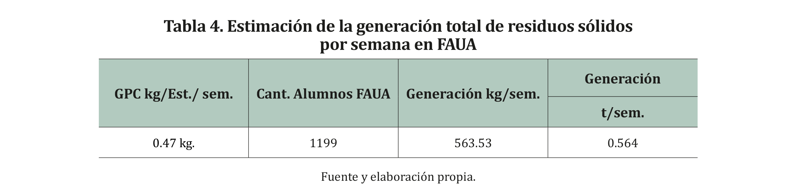 Se determinó que la generación de residuos sólidos en la Facultad de Arquitectura de la UPAO es de 563.53 kg/semana y la generación per cápita (GPC) es de 0.47 kg/alumno/semana. Siendo los estudiantes de los ciclos de 2do, 6to y 10mo los que más basura producen. Esto se debe a la exigencia en los criterios de evaluación estética de los talleres de diseño, así como a la falta de experticia en la fabricación de maquetas, sobre todo de aquellos que cursan los primeros ciclos.