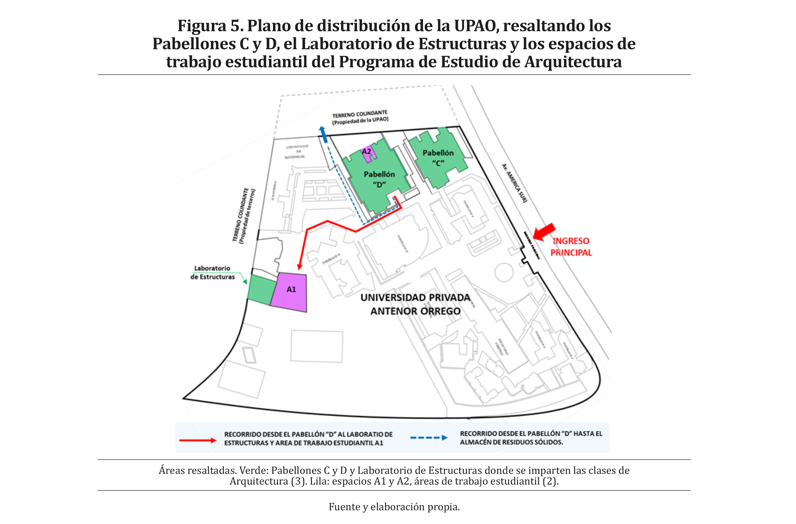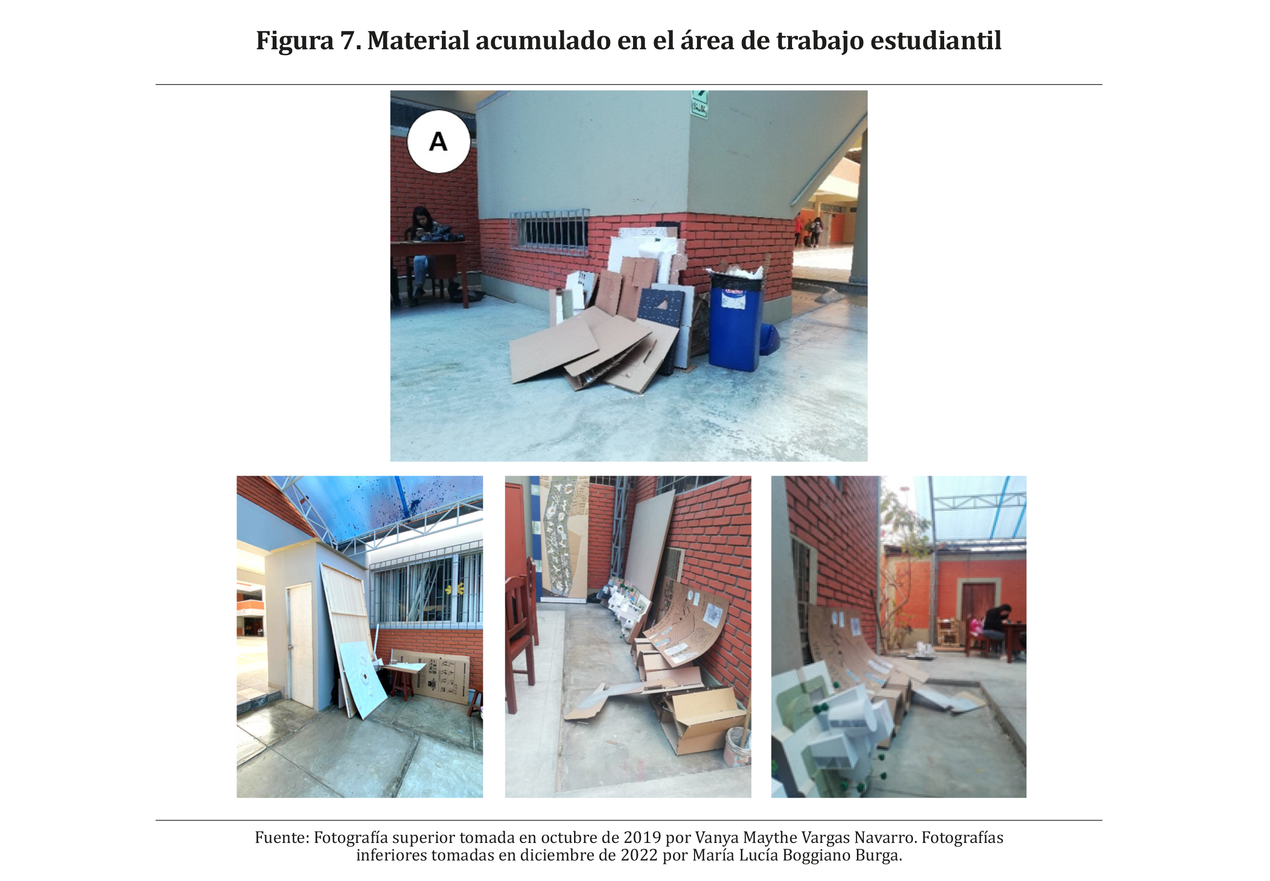 La FAUA cuenta con dos espacios de trabajo en común. El primero (área A1 de la figura 5), ubicado en la parte trasera de la Universidad, frente al Laboratorio de Estructuras, es utilizado por los alumnos para la construcción de prototipos a escala real, coberturas de madera, geodésicas y otros productos de similares características. El segundo espacio (área A2 de la figura 5), motivo de la presente investigación, se encuentra en el Pabellón D y es el centro de reunión social y de trabajo colaborativo de los estudiantes (figura 6). En dicho lugar, los materiales desechados se acumulan en las esquinas del ambiente, mientras que otros se disponen en contenedores pequeños, mezclándose con residuos orgánicos. En el semestre académico 2019-02, estas áreas fueron convertidas en zonas de acopio de basura y permanecían así hasta que el personal de limpieza realizaba su trabajo una vez a la semana (figura 7).