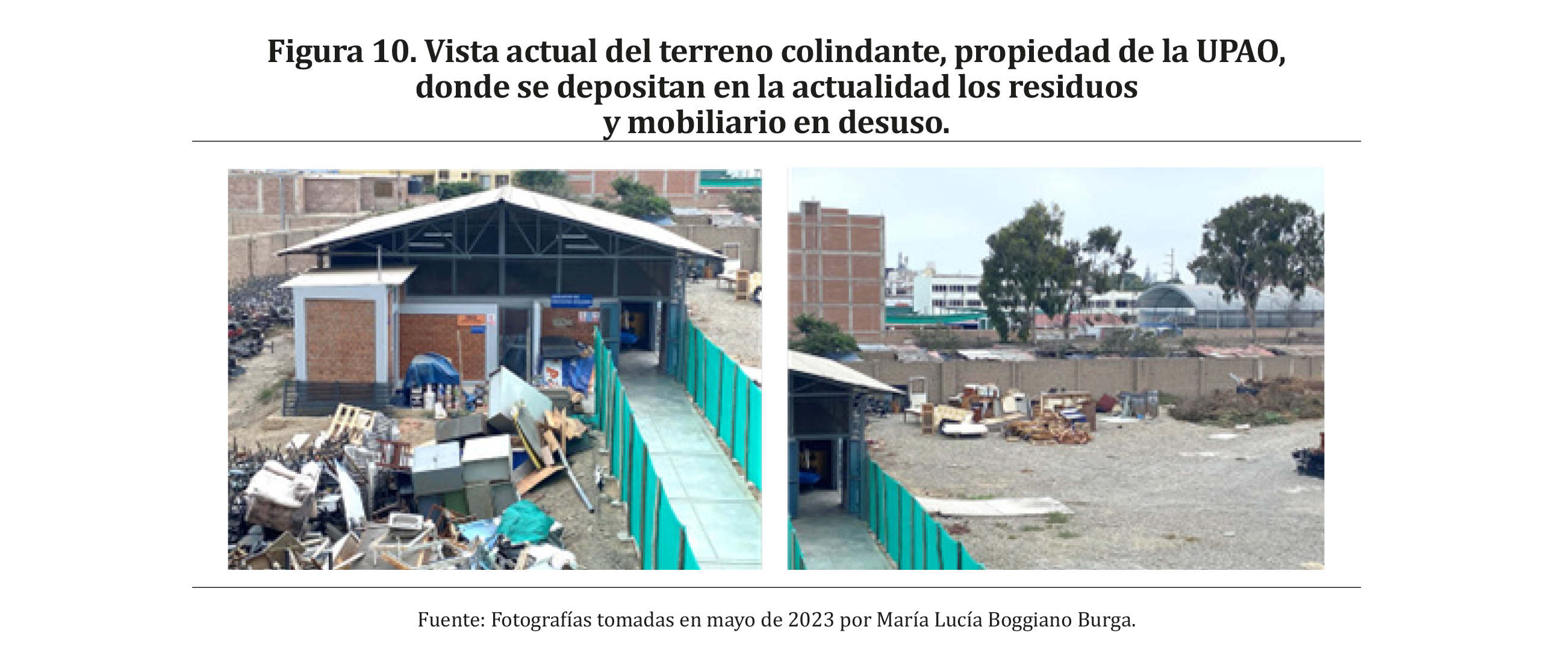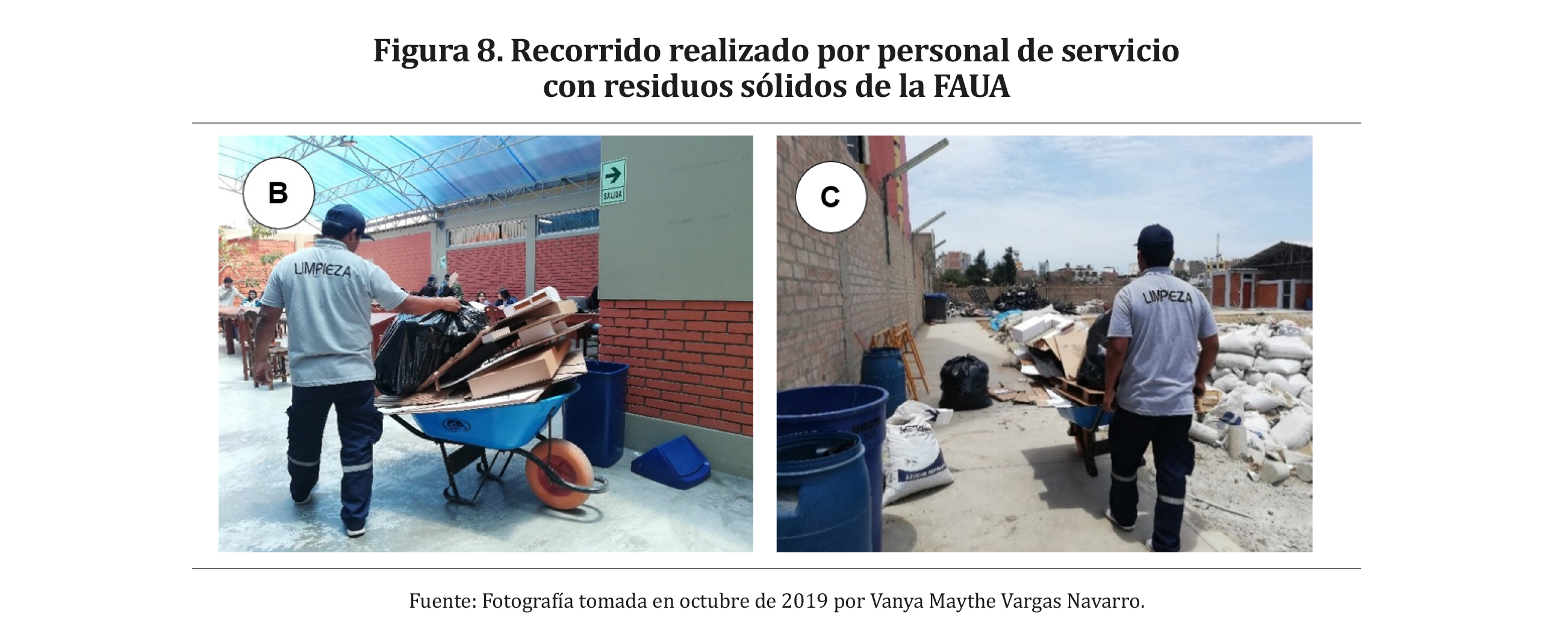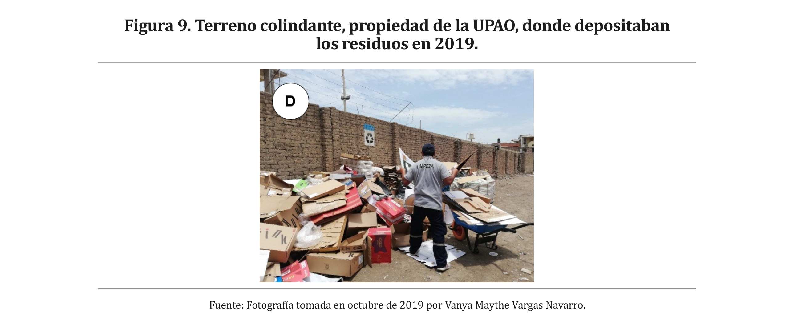 En el año 2019, se monitoreó el transporte y almacenamiento de dichos residuos (figura 8) realizado por el personal de limpieza, quienes en una carretilla Buggy los trasladaban hacia un terreno colindante, propiedad de la universidad, siguiendo una ruta no señalizada y sin la indumentaria EPS obligatoria (recorrido que se mantiene en la actualidad y que puede observarse en la figura 5). En aquel lugar se apreció dos subzonas, una que funcionaba como estacionamiento privado del personal administrativo de la UPAO y la otra que cumplía el rol de botadero.