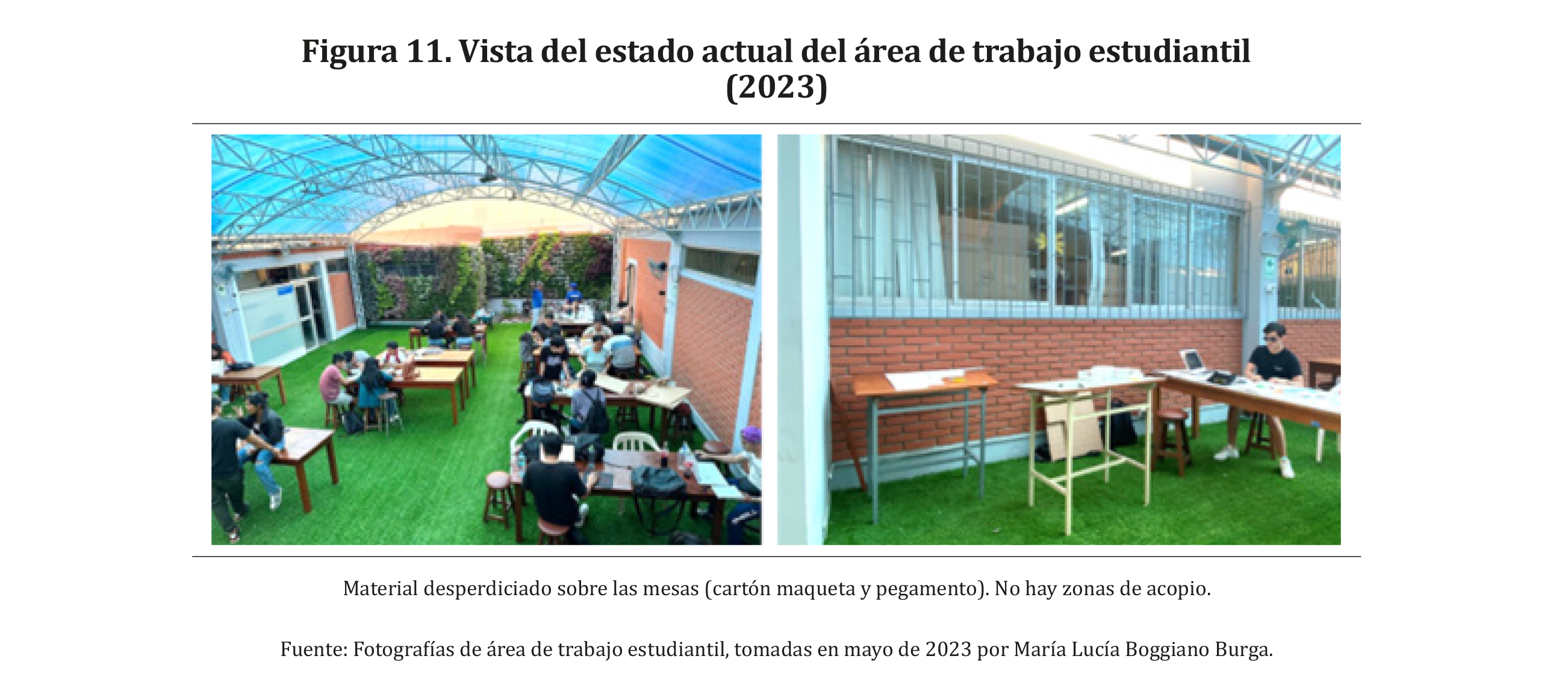 En la actualidad, 2023, el área de trabajo estudiantil (A2) ubicado en el Pabellón D se encuentra más ordenado, con un diseño llamativo y sustentable (se ha implementado un jardín seco japonés) y con mobiliario acorde a las actividades que allí se realizan; sin embargo, carece de una zona para el reciclaje, espacio necesario por la gran cantidad de cartón, cartulina y microcorrugado que son desechados a diario. Lamentablemente, la necesidad por mantener su economía obliga a los alumnos a reutilizar dichos materiales, manipulándolos de manera incorrecta sin los cuidados necesarios para evitar contacto con objetos punzocortantes e incluso biocontaminados. Si existiese una correcta señalización se podría considerar aquel espacio como un Spot del reciclaje, lamentablemente, hasta la fecha, aún no existe ningún proyecto o iniciativa para ello (figura 11).