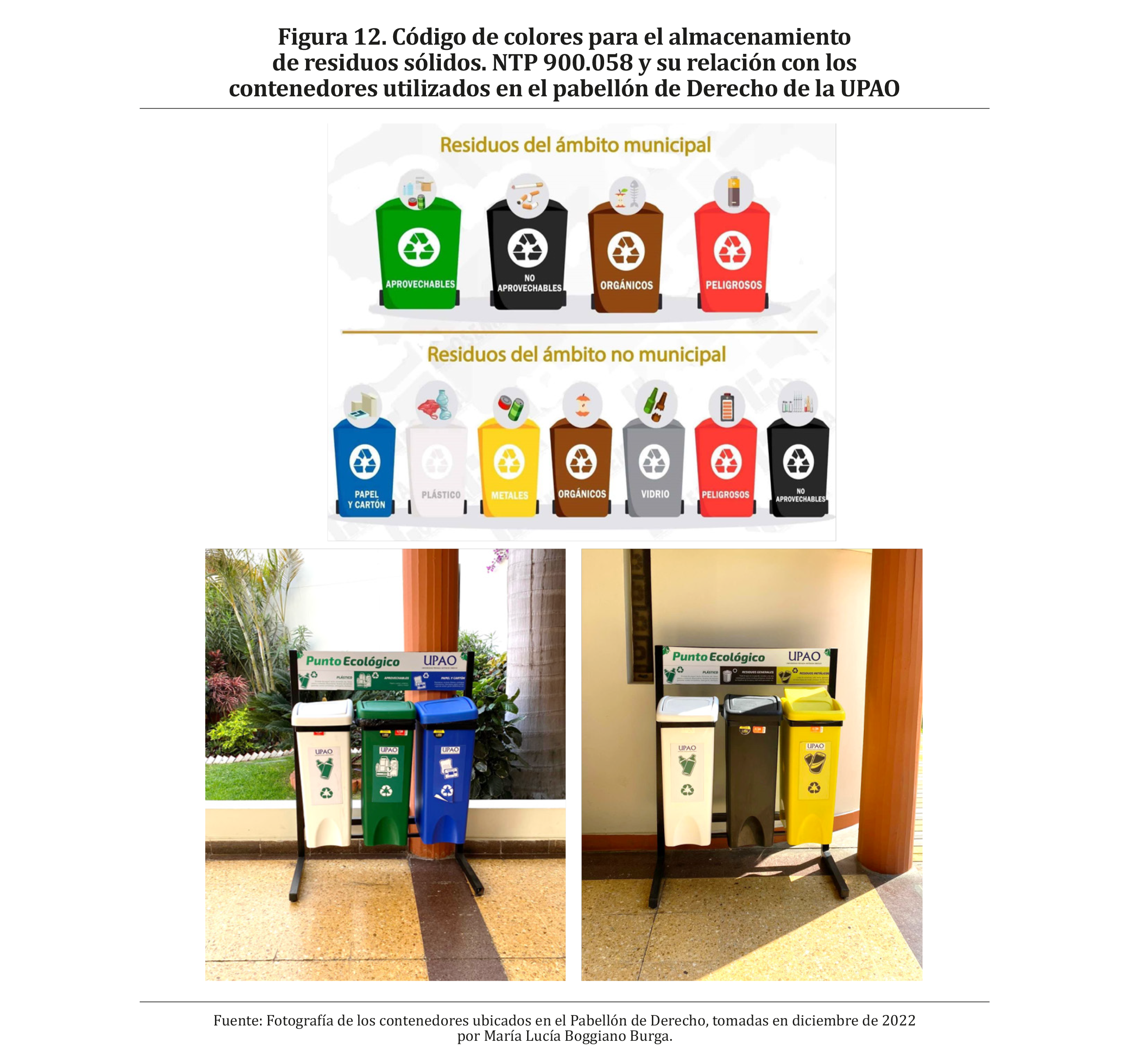 La UPAO decidió organizar los contenedores de basura según la clasificación dada por la Norma Técnica NTP 900.058-2019 del Ministerio del Medio Ambiente. Por su naturaleza, los residuosuniversitarios deben ser considerados como residuos de ámbito municipal; sin embargo, la UPAO también utiliza la clasificación del ámbito no municipal, generando, posiblemente, confusión y redundancia. Por ejemplo, en la Facultad de Derecho, (Pabellón E) se tiene dos