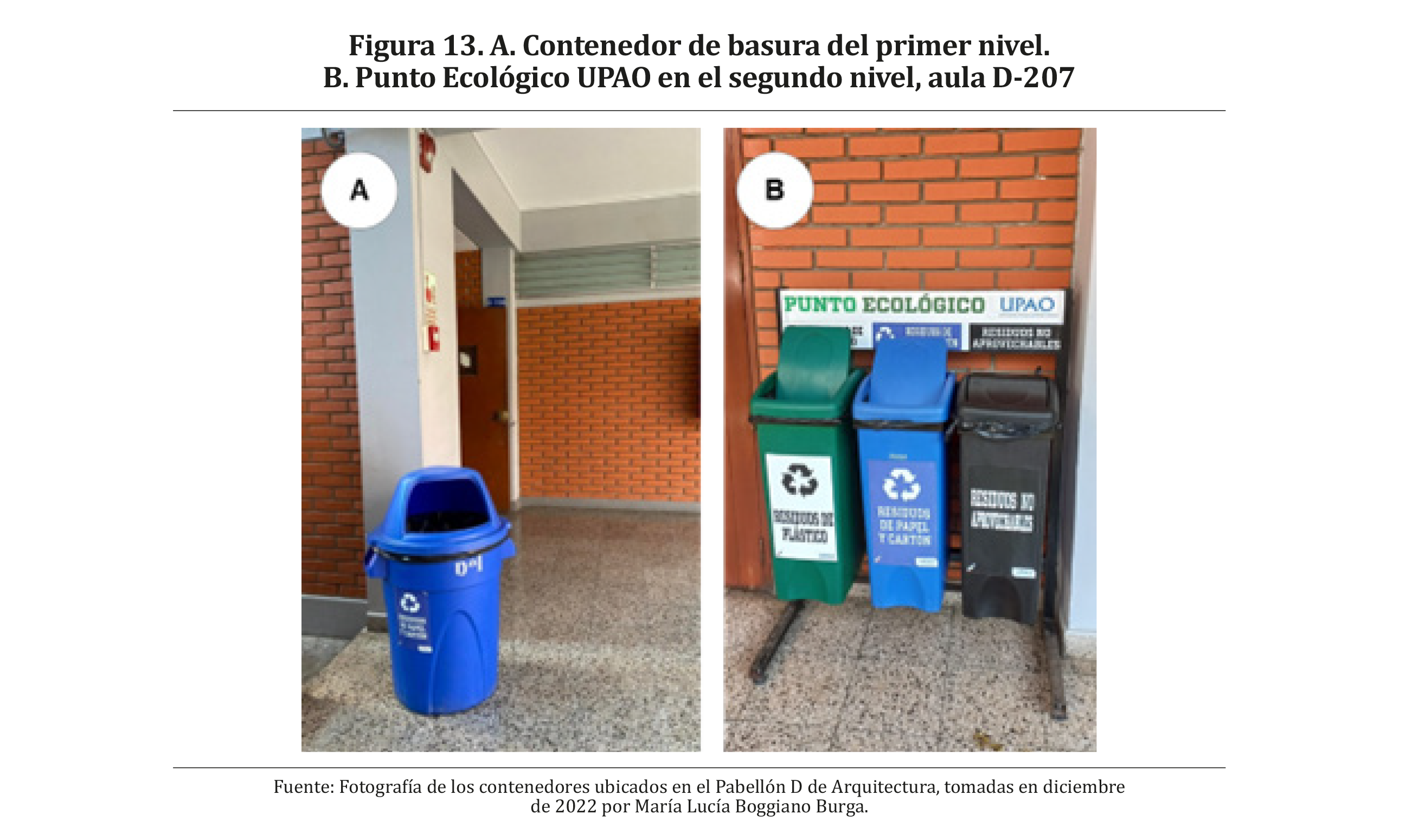 Visto esto, se realizó una comparativa entre la Facultad de Derecho (Pabellón E) y la Facultad de Arquitectura (Pabellón D). La gran diferencia se da en la cantidad y variedad de contenedores de basura que se utilizan. En el primer piso del Pabellón D se cuenta con tres tachos de basura, dos verdes sin nomenclatura y uno azul de «papel y cartón», siendo insuficientes por la variedad de desechos que se segrega en la universidad. Recién en el segundo piso aparece el «Punto Ecológico UPAO» con tres tachos de basura: negro para residuos «no aprovechables», azul para residuos de «papel y cartón» y verde para «residuos plásticos»; grave error, pues no es nada coherente con la normativa NTP 900.058-2019 (utilizada en la Facultad de Derecho). Si verdaderamente se quiere fomentar una cultura ecológica y de reciclaje, entonces se deben respetar las legislaciones medioambientales y homogeneizar los términos y parámetros para que el estudiante pueda mantener una conexión certera con el mundo exterior (figura 13).
