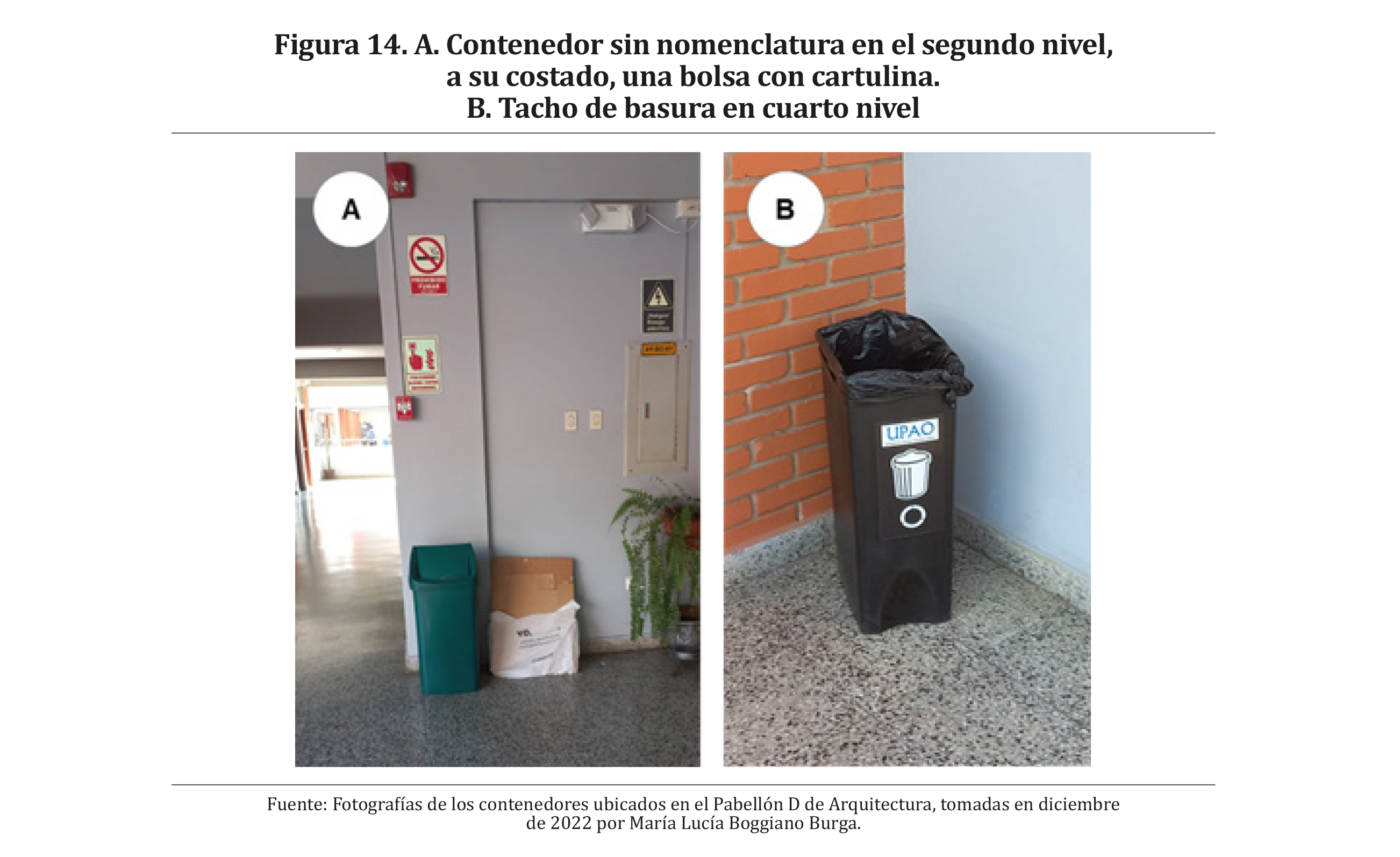 En la figura 14 se aprecia un contenedor sin nomenclatura a la salida del aula D-202 y una bolsa con cartulina apoyada al lado, ello indica la falta de un lugar o centro de acopio para aquellos materiales que no se van a utilizar y que por sus características podrían ser aprovechados por estudiantes que sí lo necesiten. El mismo problema se encuentra en el tercer y cuarto nivel del pabellón, donde no se halló ningún «Punto Ecológico UPAO», sino solo tachos de basura de color azul y negro (figura 14). La señalización es primordial para incentivar y guiar al alumno hacia una correcta cultura de reciclaje.