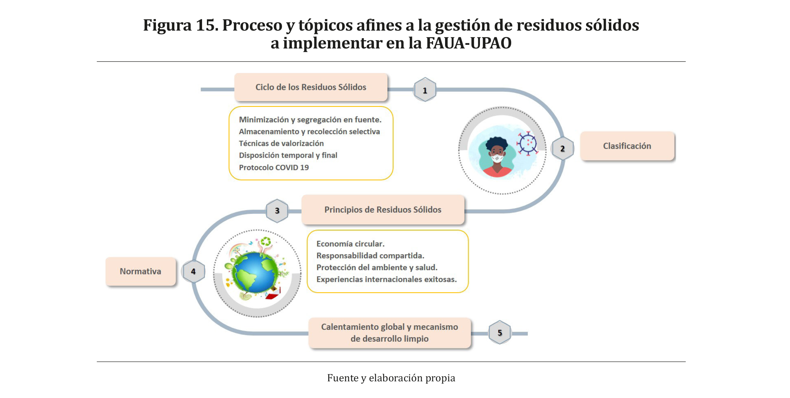 Ante la problemática y la falta de una correcta gestión de residuos sólidos en la FAUA, se vio necesario presentar la siguiente propuesta para la reutilización de los materiales desechados por los estudiantes. El éxito de dicha propuesta está basado en un «Programa de Concientización Ambiental» diseñado para los alumnos de la Facultad de Arquitectura, y pretende incluir en los sílabos de los cursos-talleres 5 temáticas y tópicos selectos de residuos sólidos: ciclo, clasificación, principios, normativa y mecanismos de desarrollo limpio (figura 15). La implementación será gradual, con un total de 60 horas distribuidas en los 4 meses que dura el ciclo académico.