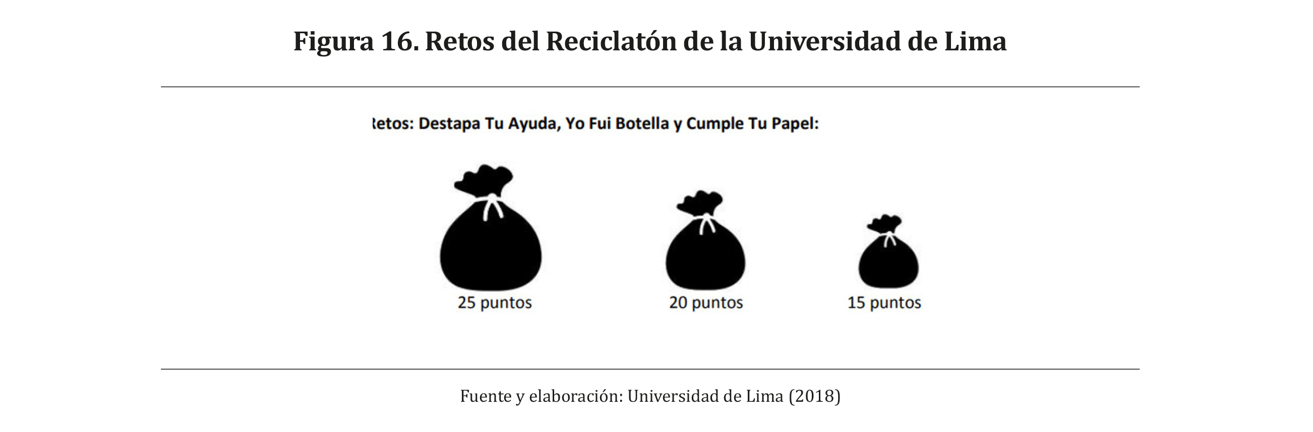 De otro lado, la Universidad de Lima recolecta los residuos sólidos para su reciclaje o donación a obras sociales. Los grupos inscritos deben participar en tres retos durante tres días consecutivos para ganar un puntaje acumulativo (figura 16): «Destapa tu ayuda», con el objetivo de reunir la mayor cantidad de tapitas de plástico de botellas; «Yo fui botella», donde solo se reúnen botellas de agua y gaseosas; y «Cumple tu papel», que recauda papeles de impresión y escritura, periódicos, sobres, folletos y embalajes (Universidad de Lima, 2019). Asimismo, vale mencionar que la Universidad de Lima realiza, cada cierto tiempo, campañas de recolección de residuos de aparatos electrónicos y eléctricos (RAEE), con el fin de disminuir el impacto de la minería y dichos metales en el aire, suelo y agua.