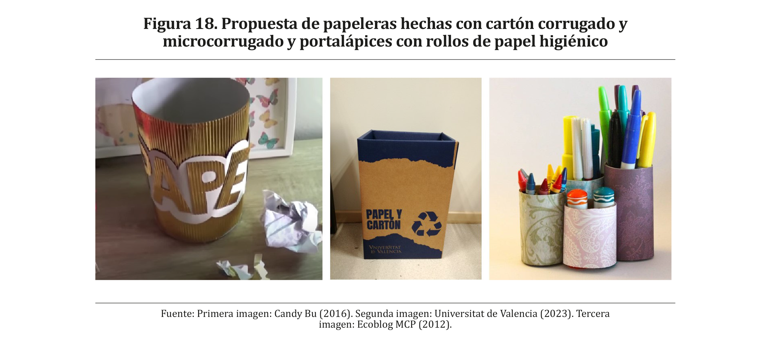 Los residuos, previamente clasificados, se dispondrán en un estante con dos o tres separadores horizontales y distribuidos en cada pared lateral con el fin de evitar la aglomeración y desorden de los alumnos. Cada estante corresponderá a los cuatro tipos de residuos aprovechables (cartón, cartulina, tecnopor y madera) y contará con un rótulo del color respectivo. Estos materiales podrán ser utilizados para elaborar maquetas de crítica y/o presentación final; prototipos de madera para detalle estructural y coberturas; o para el propio uso de la facultad, por ejemplo, en la fabricación de papeleras «ecológicas» hechas con cartón microcorrugado, las que podrían ayudar a la correcta clasificación y segregación de la basura dentro del aula. Sumado a ello, y bajo un futuro programa de recolección de residuos, se podría confeccionar porta lapiceros/plumones para los docentes y alumnos utilizando los rollos de papel higiénico (figura 18).