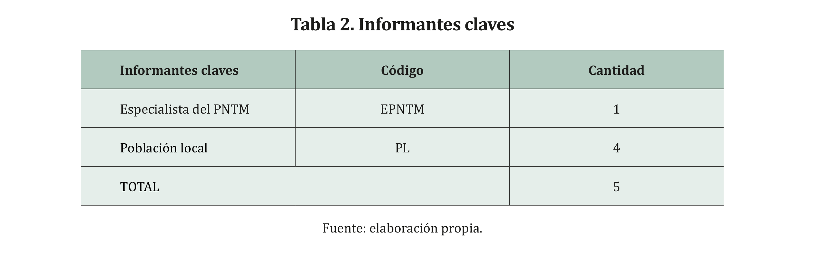 Por el lado cualitativo, se aplicaron entrevistas semiestructuradas a profundidad (Hennink et al., 2010; Creswell, 2014; Hernández et al., 2014; Ñaupas et al., 2014), que estuvieron dirigidas a los informantes claves (Mendieta, 2015; Seidman, 2006), quienes fueron seleccionados mediante muestreo por conveniencia (López & Fachelli, 2015), debido a la representatividad que tienen los participantes en el caso de estudio. Ellos son guardabosques y gestores del Parque, así como parte de la población local. Cabe resaltar que se decidió codificar a los informantes claves, tal cual se señala en la Tabla 2, debido a su derecho de confidencialidad por consentimiento informado. Los acuerdos previos a la entrevista para explicar la finalidad de la investigación se desarrollaron vía telefónica, para luego aplicarse en el mismo lugar de la investigación.