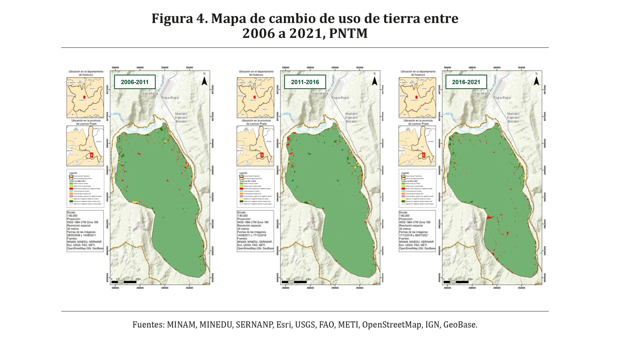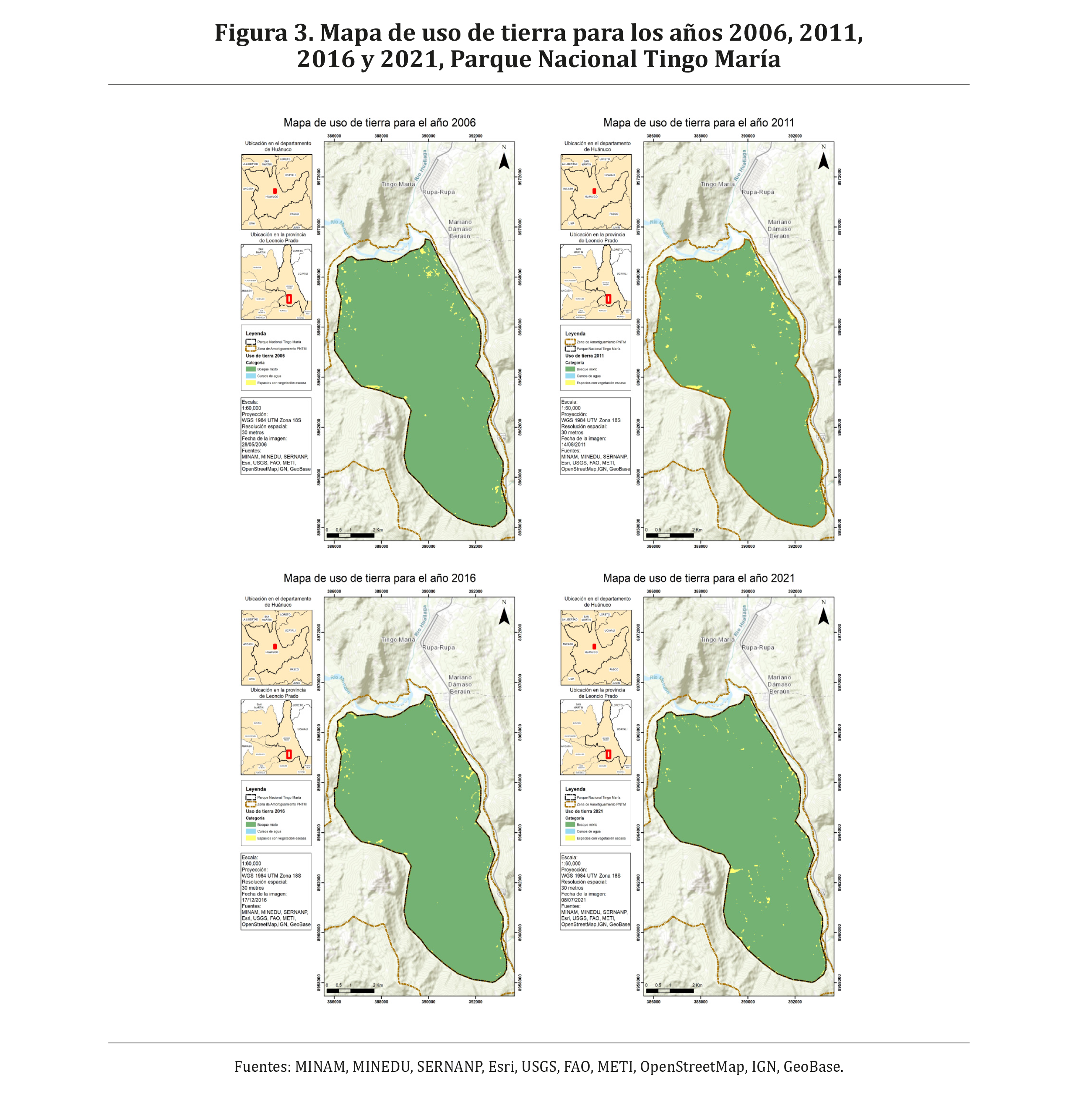 Este estudio tiene como objetivo principal estimar el cambio de uso de tierra entre los años 2006 a 2021, a la vez que se evalúa la pérdida/ganancia de la cobertura vegetal, dentro del área del PNTM. Para ello, se muestra a continuación cuatro mapas elaborados a partir de la cobertura de tierra de los cuatro años estudiados (Figura 3).