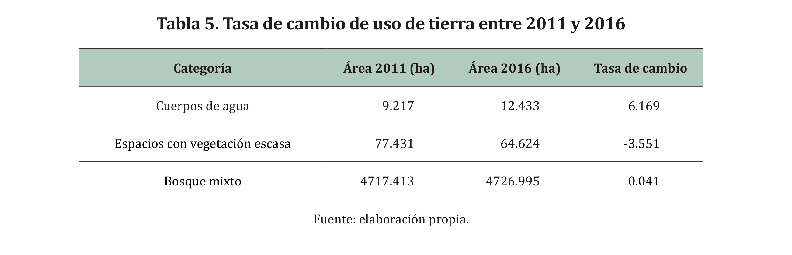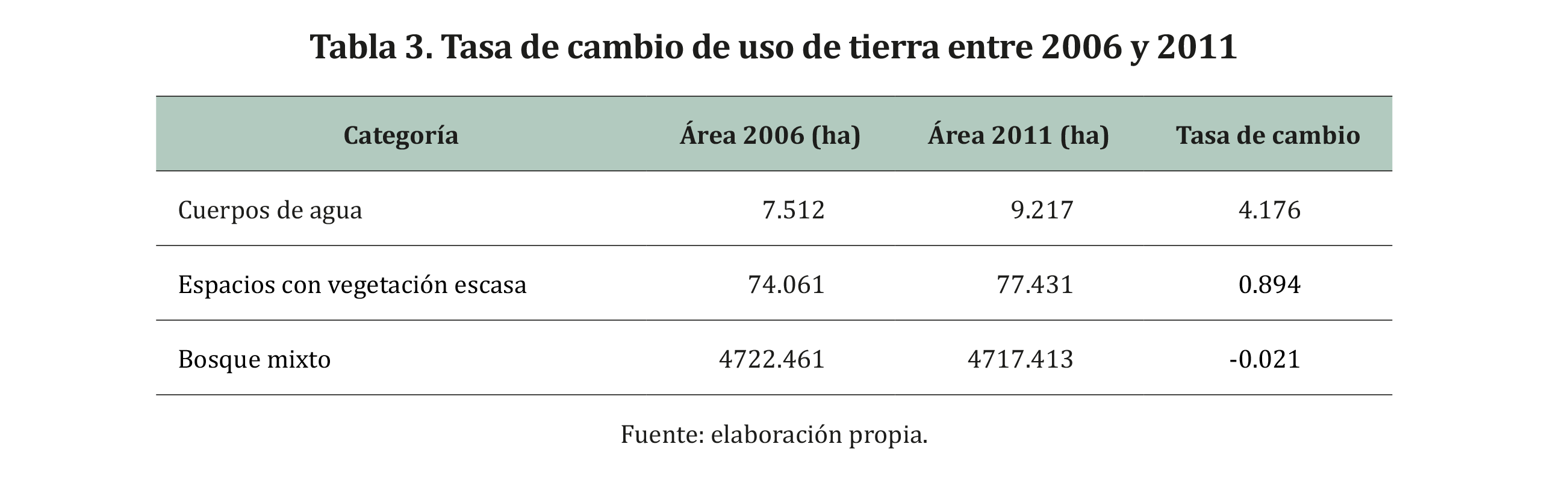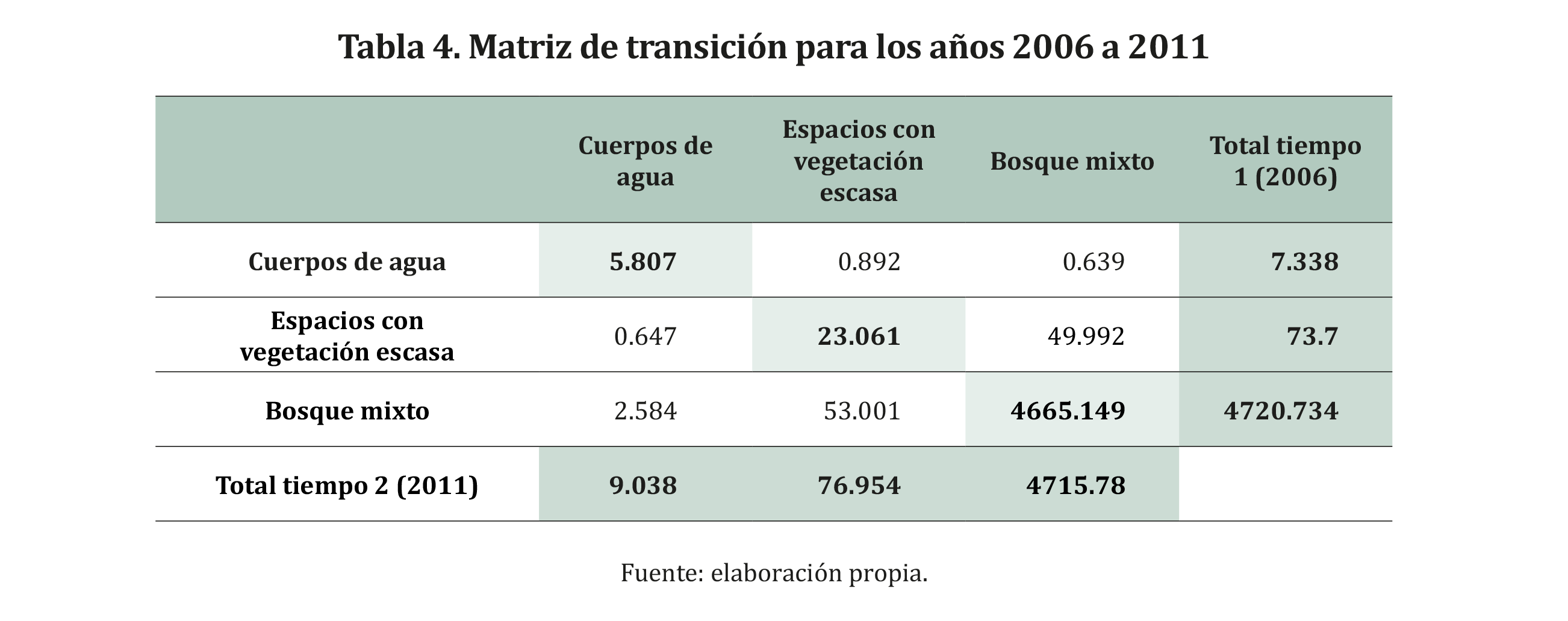 Concretamente, se aprecia un aumento del 4.176% en cuerpos de agua y del 0.894% en espacios con vegetación escasa; en contraparte, el bosque mixto pierde alrededor del 0.021% de su extensión. Para mayor detalle, se puede apreciar la matriz de transición (Tabla 4) entre 2006 y 2011, según categorías propuestas.