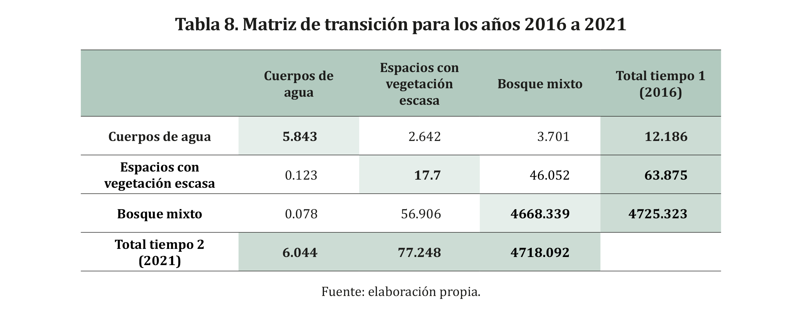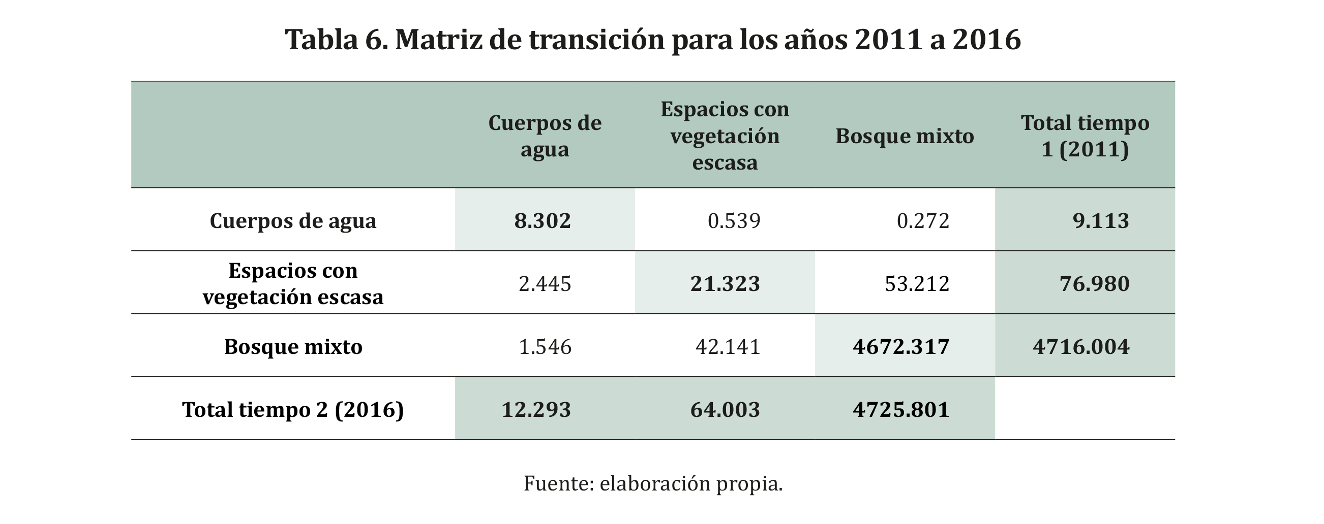 Se aprecia una pérdida del 3.551% de espacios con vegetación escasa, mientras que los bosques mixtos ganaron un 0.041% de cobertura en un periodo de cinco años. Del mismo modo, en la siguiente matriz de transición (Tabla 6) se pueden apreciar con mayor detalle los cambios entre categorías: