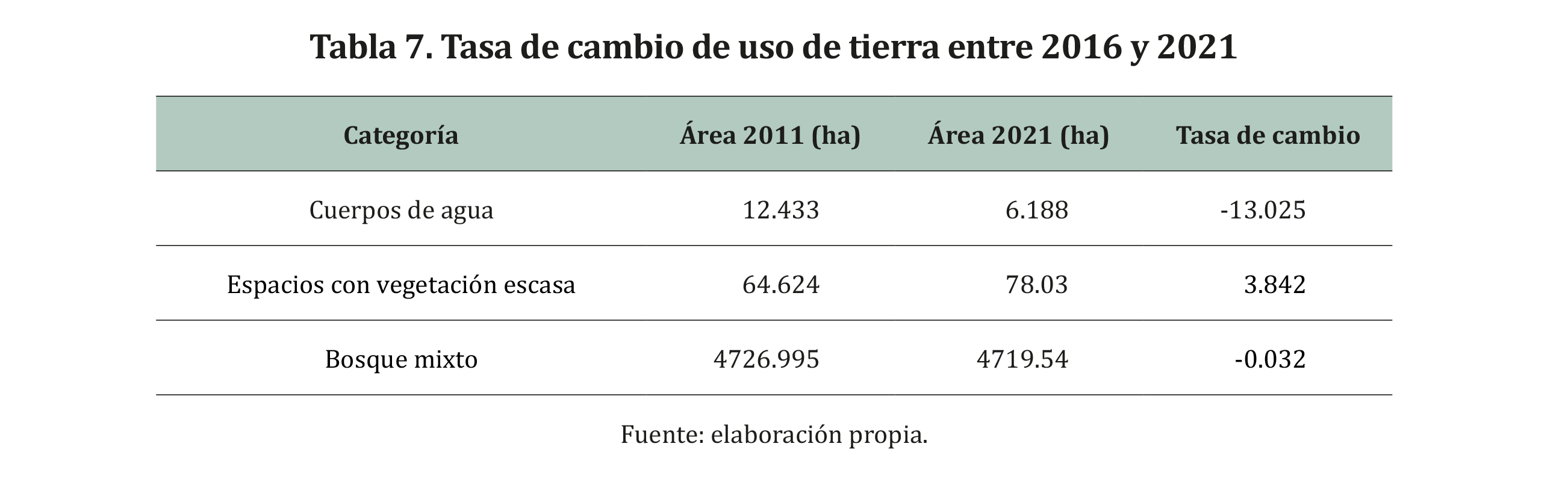 Para este último bloque de años, resalta el cambio de zonas de bosques a zonas de vegetación escasa. Ello es abordado a profundidad en las tablas siguientes (Tabla 7 y