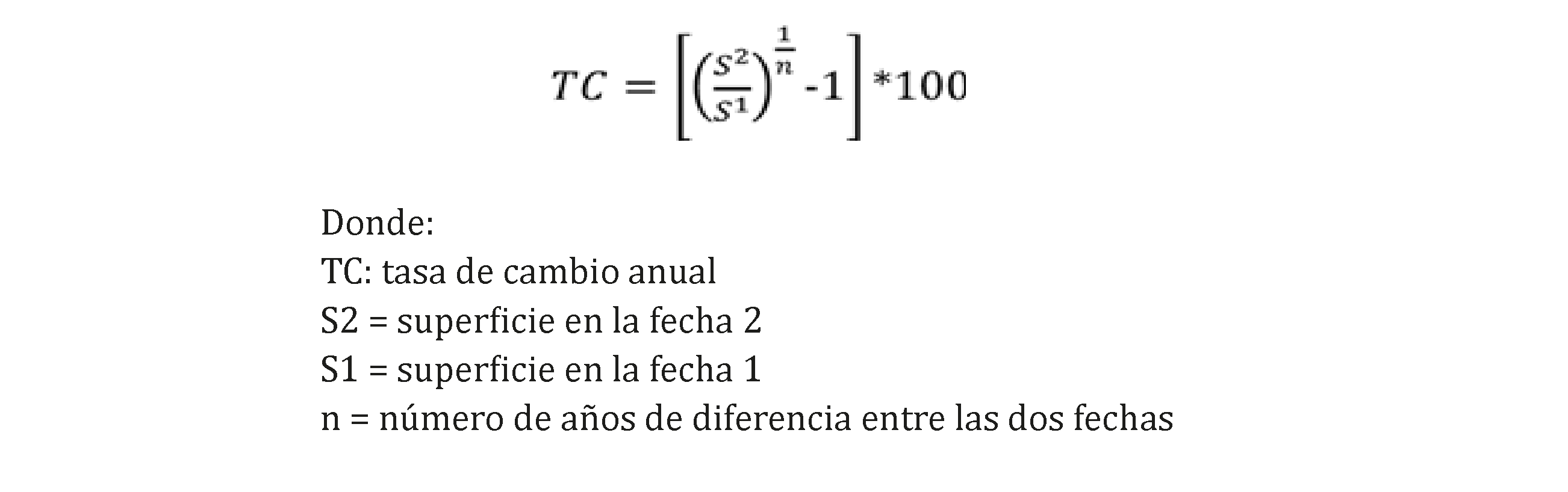 Luego, se procedió con la elaboración de las matrices de transición para estimar la tasa de cambio entre años. Como referencia, se utiliza la ecuación propuesta por la FAO (1996), que permite calcular la tasa de cambio entre años (Ruiz et al., 2013)[2]: