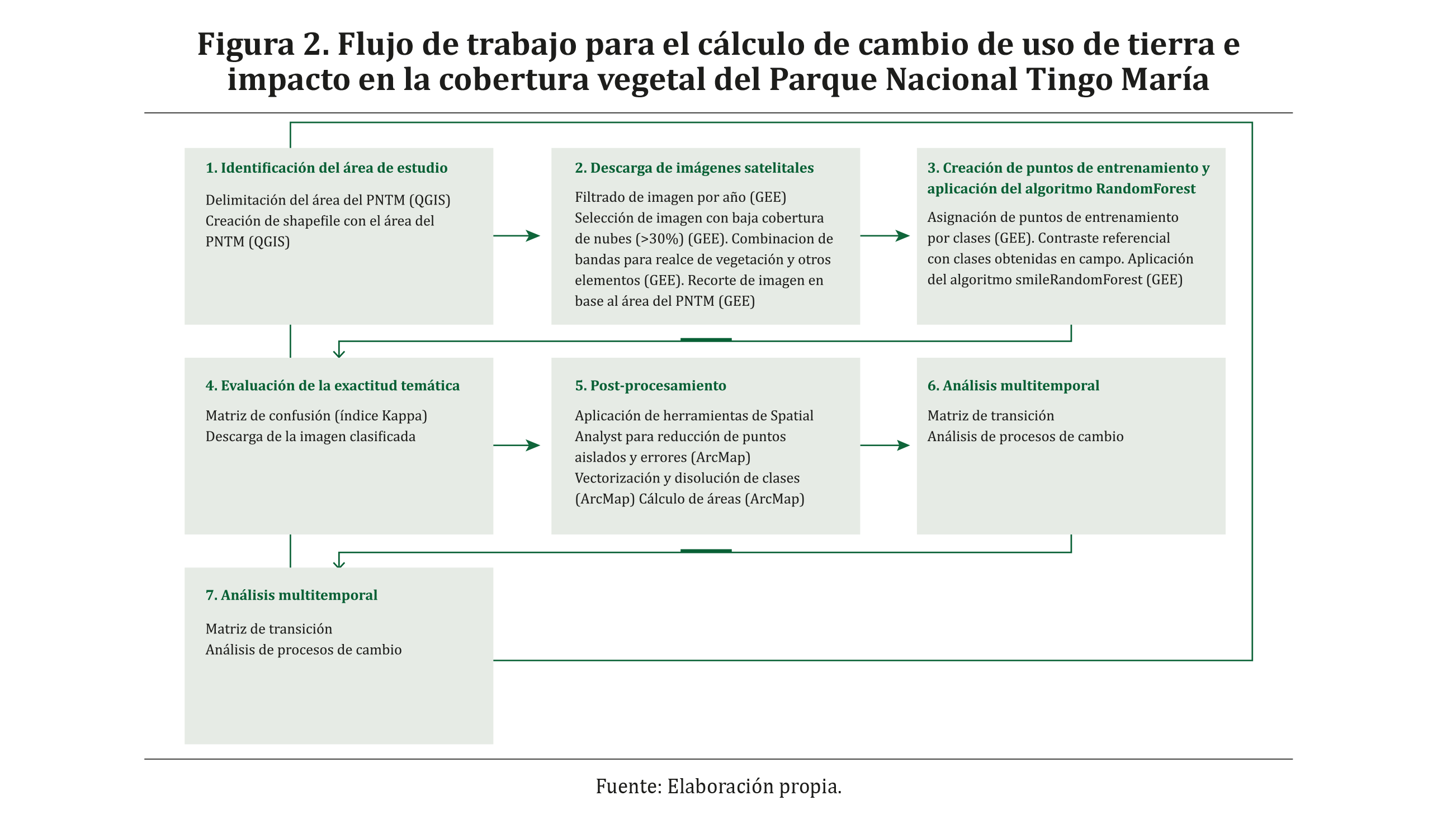El primer paso fue delimitar el área de estudio, para lo cual se contó con la ayuda del Visor de las Áreas Naturales Protegidas (GEOANP) del Servicio Nacional de Áreas Naturales Protegidas por el Estado (SERNANP)[1]. Para ello se requirió del software QGIS 3.24, el cual es un Sistema de Información Geográfica (SIG) de escritorio, y soporta múltiples formatos y funcionalidades de datos de tipo vector, ráster y bases de datos (QGIS, 2023). Además de ello, tiene la ventaja de ser un software gratuito, de código abierto sujeto a la Licencia General Pública GNU (General Public License) (QGIS, 2022). El proceso consistió en filtrar el polígono que representa el área del PNTM y exportarlo a un nuevo archivo vectorial individual, para así utilizarlo como límite de las imágenes satelitales utilizadas. Para una mayor comprensión del procedimiento completo, se puede observar el siguiente flujo de trabajo (ver Figura 2)