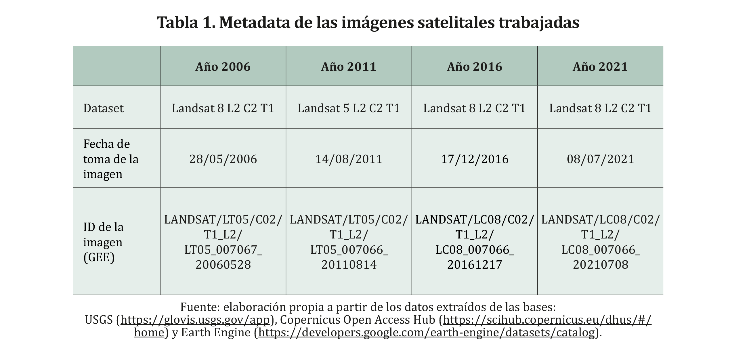 Otros factores que se tomaron en cuenta fueron la periodicidad de las imágenes (una imagen por año estudiado, en fechas más o menos similares), la metadata del área estudiada (Hurtado et al., 2020) y las resoluciones espacial, radiométrica y espectral.