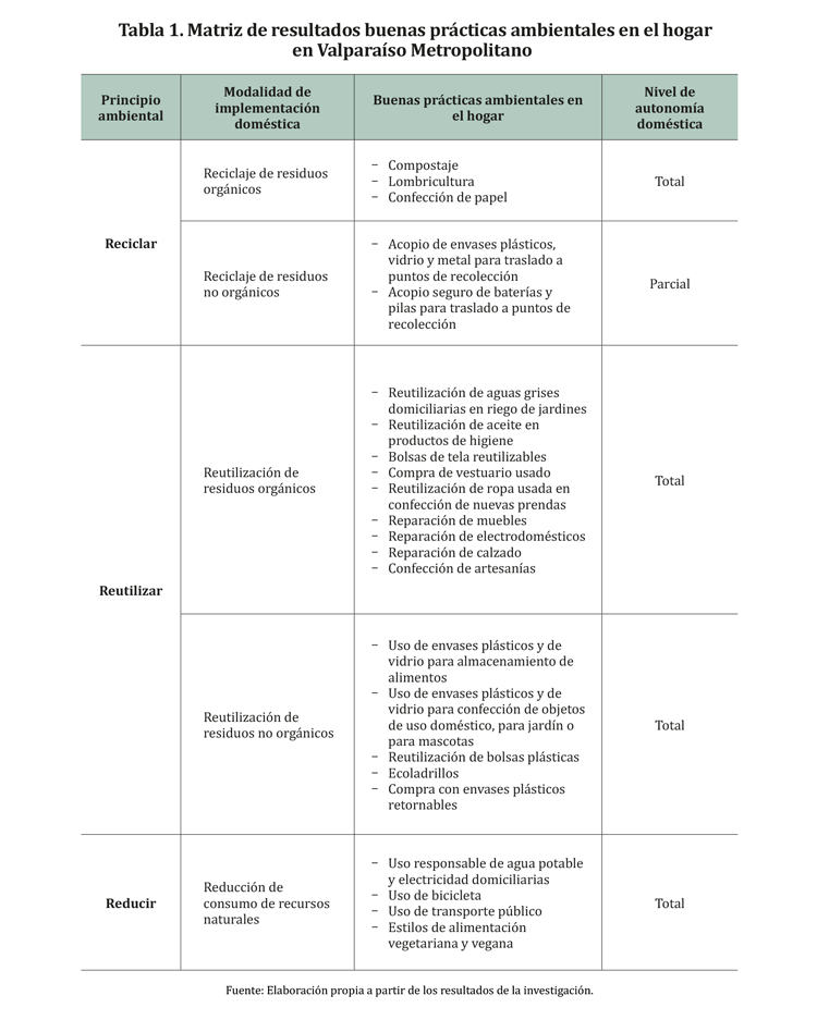 A modo de síntesis, la investigación confirma la aplicación de los principios ambientales de reciclar, reutilizar y reducir con total autonomía para su realización en el hogar, a excepción de reciclaje de residuos no orgánicos. La Tabla 1 expone el detalle de BPA identificadas y los niveles de autonomía doméstica plena o relativa que alcanzan en su implementación.