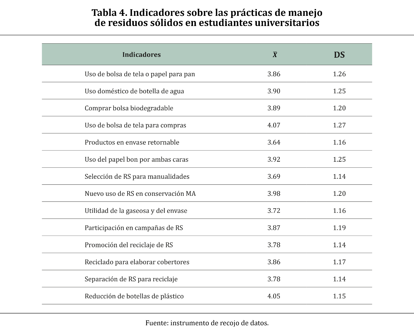 Respecto a los indicadores de las prácticas de manejo de residuos sólidos, se halló que las más realizadas según promedio aritmético fueron el utilizar bolsa de tela para realizar compras, reducir o aplastar las botellas de plástico en el reciclaje y dar un nuevo uso a los residuos sólidos para conservar el medioambiente. Las prácticas menos realizadas fueron seleccionar residuos sólidos para realizar manualidades, así como utilizar productos de envase retornable. Siendo consistente el estudio con Hao et al. (2020), quienes reportan en sus resultados que la mayoría de los estudiantes universitarios siempre y algunas veces realizan la separación de residuos sólidos y los estudiantes de las carreras de ciencias y del último año tienen mayor probabilidad de participar en la práctica de separación de residuos sólidos. De igual manera, Silvero y Villasante (2021) reportaron gran porcentaje de separación correcta de plásticos y separación de papeles o cartones, demostrándose el cambio de hábito en la correcta gestión de los residuos sólidos. Sin embargo, el estudio de Aikowe y Mazancova (2021), en Nigeria, mostró que el control conductual percibido tuvo el mayor impacto en el plástico, con intenciones de clasificación y seguimiento de normas de forma subjetiva, De ahí la importancia de que los estudiantes universitarios promuevan o tengan buenas prácticas en el reciclaje, sobre todo del plástico, por la demora en la degradación y por la alta contaminación que produce.