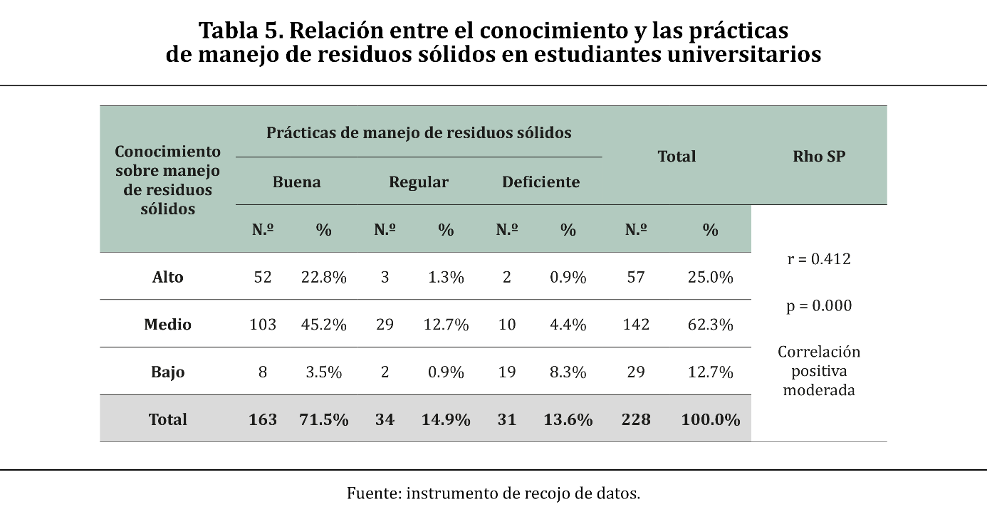 En la tabla 5 se observan proporciones significativas que muestran una estrecha relación entre ambas variables de estudio, predominando las deficientes prácticas de manejo de residuos sólidos en estudiantes universitarios con nivel bajo de conocimiento (8.3%), y mayor proporción de buenas prácticas en estudiantes universitarios con nivel medio y alto de conocimiento (45.2% y 22.8%). La prueba Rho de Spearman encontró relación significativa entre ambas variables de estudio (r = 0.412, p = 0.000), comportándose de forma positiva moderada, es decir que, a mayor nivel de conocimiento, las prácticas son mejores.