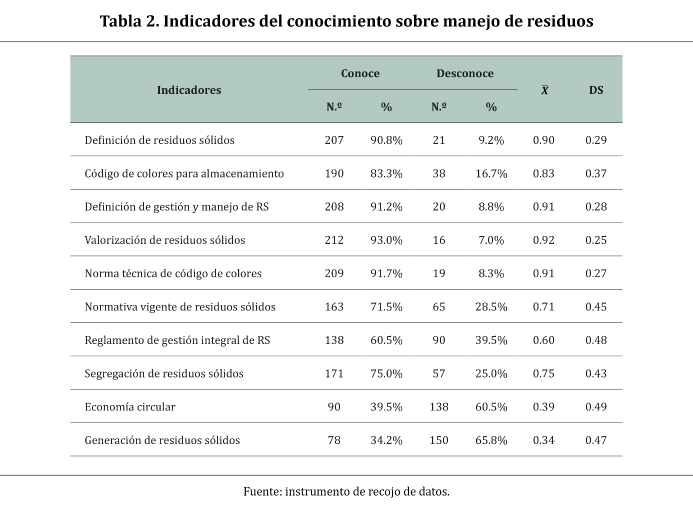 En cuanto a los resultados de los indicadores del conocimiento sobre manejo de residuos sólidos, en su mayoría los estudiantes conocen sobre la utilidad que se le debe dar a los residuos sólidos, siendo capaces de identificar correctamente el código de colores para su almacenamiento, además de conocer la gestión que regula el manejo adecuado de los residuos sólidos, así como un porcentaje predominante desconoce sobre la generación de residuos sólidos a nivel nacional, regional o distrital. Esto nos indica que se tiene que ilustrar y educar más en este aspecto. Estos hallazgos son favorables en la mayoría de los indicadores, y demuestran que los estudiantes como actores principales de la institución educativa superior pueden coadyuvar en la difusión educativa de competencias a la sostenibilidad ambiental para reducir aspectos negativos del medioambiente.
