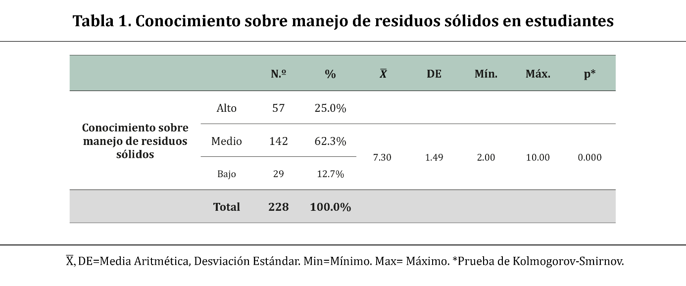 En cuanto al análisis de las variables, se ejecutó con el programa SPSS versión 25, se empleó la estadística descriptiva, obteniéndose frecuencias y porcentajes estadísticos, los cuales fueron plasmados en tablas y gráficos. Mediante la prueba de Kolmogorov-Smirnov se determinó que los datos no provenían de una distribución normal (p<0.05). Por ello, para relacionar las variables de conocimiento y prácticas sobre manejo de residuos sólidos, así como para probar la hipótesis alterna de investigación, se utilizó la prueba estadística de Rho de Spearman, aplicando una confiabilidad de 95% y un nivel de significancia p<0.05.