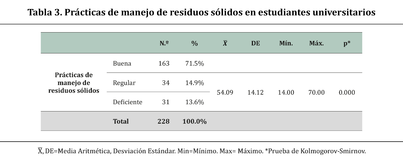 En la tabla 3 se muestra que el 71.5% de estudiantes universitarios tiene buenas prácticas de manejo de residuos sólidos, 14.9% regular y 13.6% deficientes. La media aritmética (