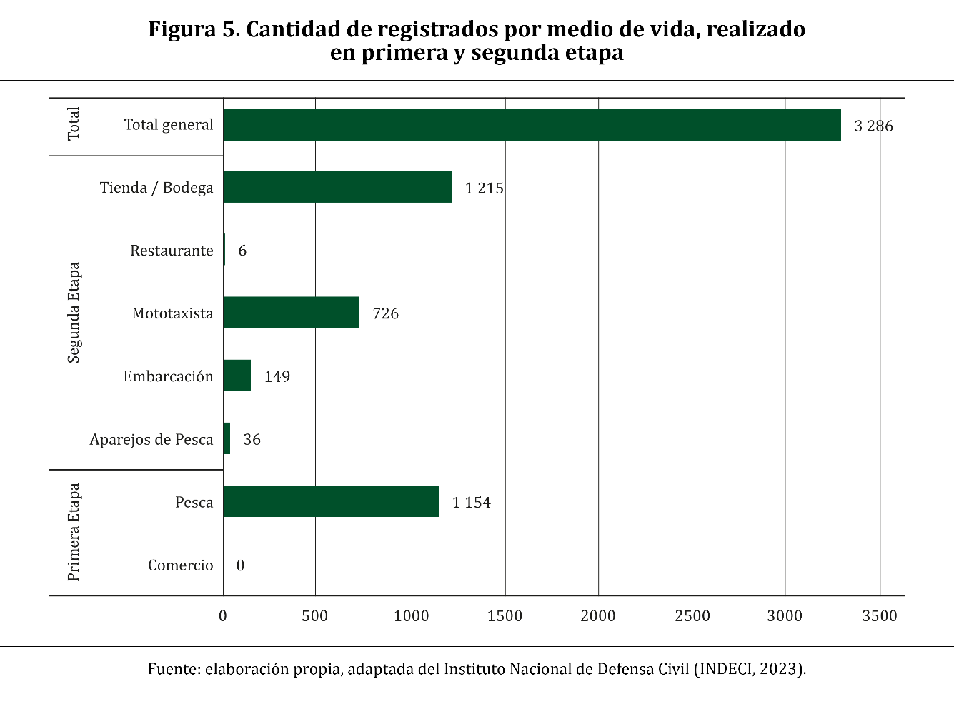Gráficamente se muestra que la mayor cantidad de afectados se relacionan con «Tienda/Bodega» y «Pesca» (4253 registrados). La menor cantidad corresponde a «Restaurante», con solo seis inscritos.