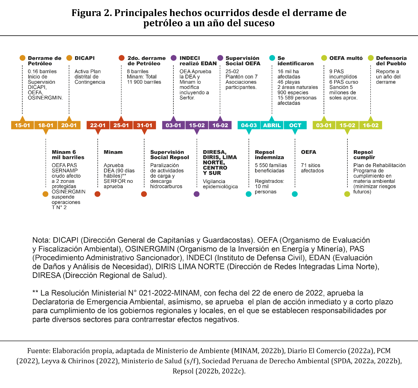 Repsol activó un plan de contingencia días después del suceso (Repsol, 2022a), aunque la coordinación entre el gobierno nacional y local fue criticada por la Organización de las Naciones Unidas (ONU, 2022), por ser insuficiente en la atención humanitaria y socioeconómica a los afectados. En la Figura 2 se presentan los hechos más resaltantes en el primer año desde que se produjo el derrame.