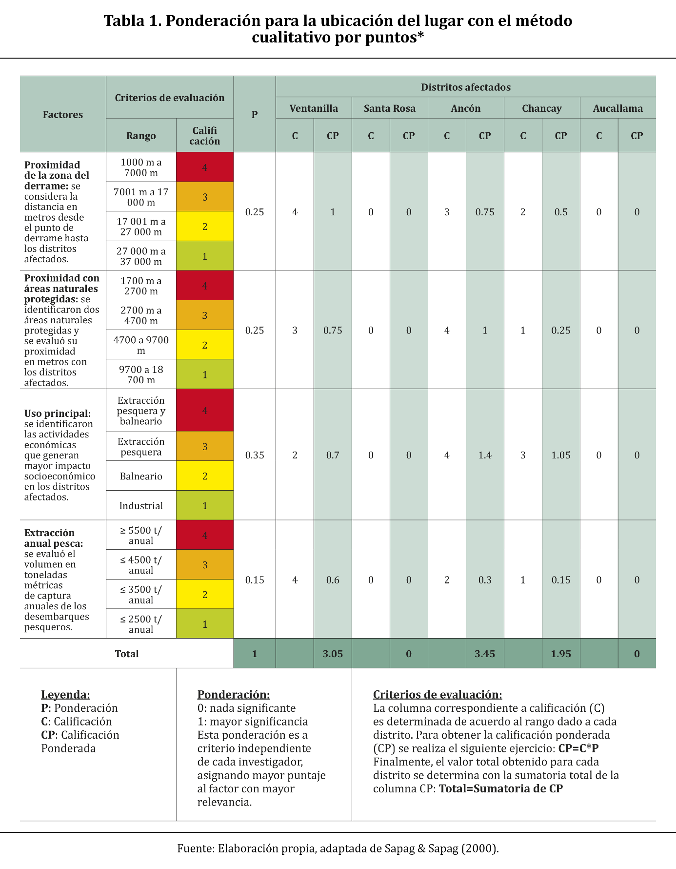 Se aplicó el «método cualitativo por puntos» (Sapag & Sapag, 2000) para determinar el distrito más afectado, en el que se identificaron los factores de localización más relevantes y se aplicaron criterios de evaluación y un valor de ponderación (ver Tabla 1). Se empleó la revisión bibliográfica para evaluar la importancia relativa de cada factor (Saaty, 2008).