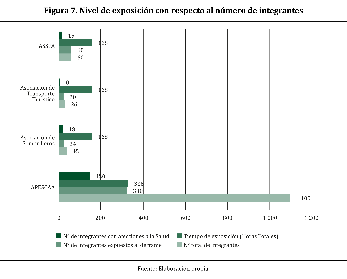 La Figura 7 nos muestra el total de integrantes afectados por asociación, siendo APESCAA la que registra el mayor número de integrantes y la Asociación de Transporte Turísticos el menor número. El nivel de exposición se determinó por la cantidad de personas expuestas al petróleo debido a las labores de limpieza de playas y el tiempo que duraron las jornadas de trabajo, resultando APESCAA con el mayor tiempo de exposición (360 horas), las asociaciones restantes tuvieron 180 horas.