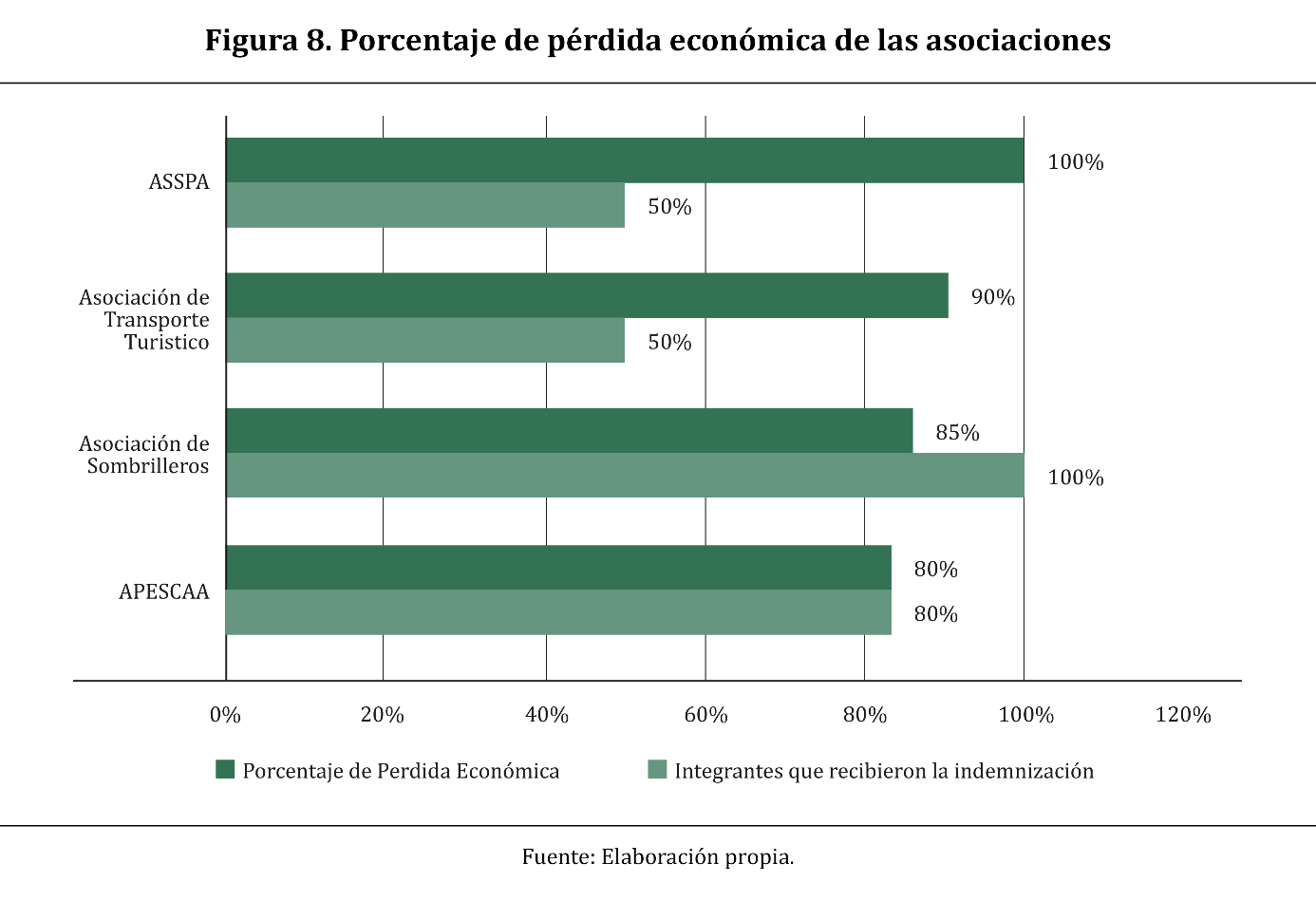 A pesar de no tener la información exacta respecto a la pérdida económica, los representantes la estimaron de forma porcentual basándose en el aporte que cada integrante realiza a la asociación. Como se observa en la Figura 8, la Asociación de Transporte Turístico y ASSPA obtuvieron la cifra mayor con pérdidas económicas del 100% y 90%, respectivamente, seguido de la Asociación de Sombrilleros y APESCAA, con 85% y 80%.