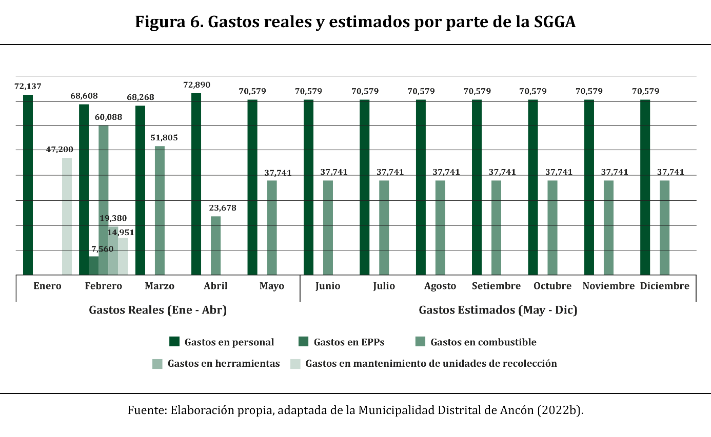 La Municipalidad Distrital de Ancón (2022a) remitió dos informes de la SGGA. En el Informe 117 se describen las acciones que realizaron frente al derrame: registro fotográfico de los hechos, limpieza de piedras con paños absorbentes, extracción de animales muertos, succión de agua de mar contaminada. En el informe 154 se describen los gastos reales y estimados por limpieza y restauración de la SGGA (Municipalidad Distrital de Ancón, 2022b). La Figura 6 resalta los gastos en personal y mantenimiento de unidades de recolección.