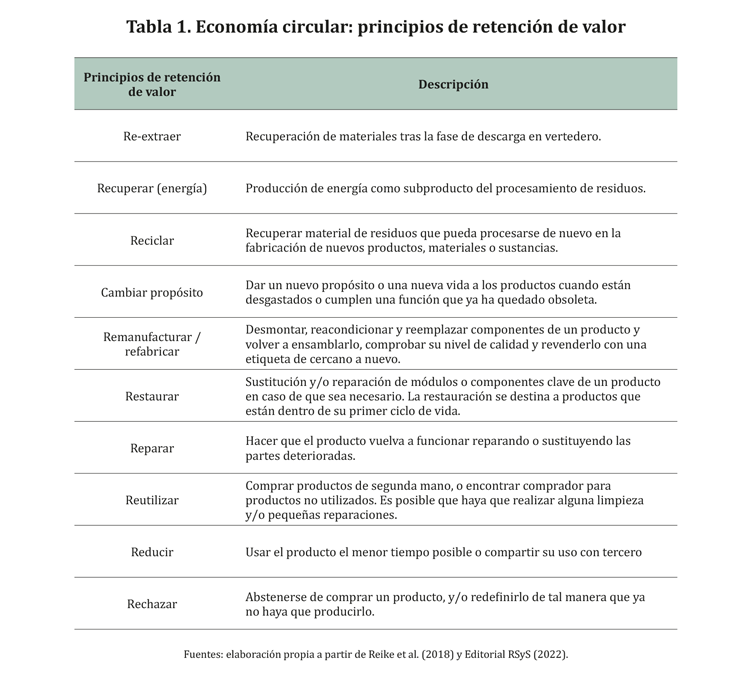 La concepción dominante de la economía circular, tal y como se recoge con mayor frecuencia en las políticas urbanas, gubernamentales y en el debate científico, se basa en la promesa de la posibilidad de desacoplar el crecimiento económico del impacto ambiental mediante un aumento de la eficiencia, que debería alcanzarse en gran medida mediante el despliegue de altas tecnologías y de mecanismos tecnocráticos basados en el mercado (Giampietro, 2019). Esta noción de economía circular también hace hincapié en las oportunidades y en el crecimiento económico que la economía circular puede generar, en el carácter beneficioso para todas las partes implicadas de una transición hacia una economía circular, y en el papel protagonista de los gobiernos y del sector empresarial. También implica que la prosperidad social depende de unas tasas de consumo elevadas y en constante crecimiento. No es de extrañar, por tanto, que esta noción de economía circular haga hincapié en principios relacionados con la eficiencia, como el reciclaje y la refabricación (Tabla 1), que implican intercambios de mercado, la producción de ganancias monetarias y el desarrollo tecnológico. Por el contrario, subestima los principios relacionados con la suficiencia, como el rechazar y reducir el consumo de recursos (Tabla 1); principios que pueden desplegarse fuera del mercado, rara vez generan ganancias monetarias y a menudo no requieren el uso de alta tecnología (Reike et al., 2018).