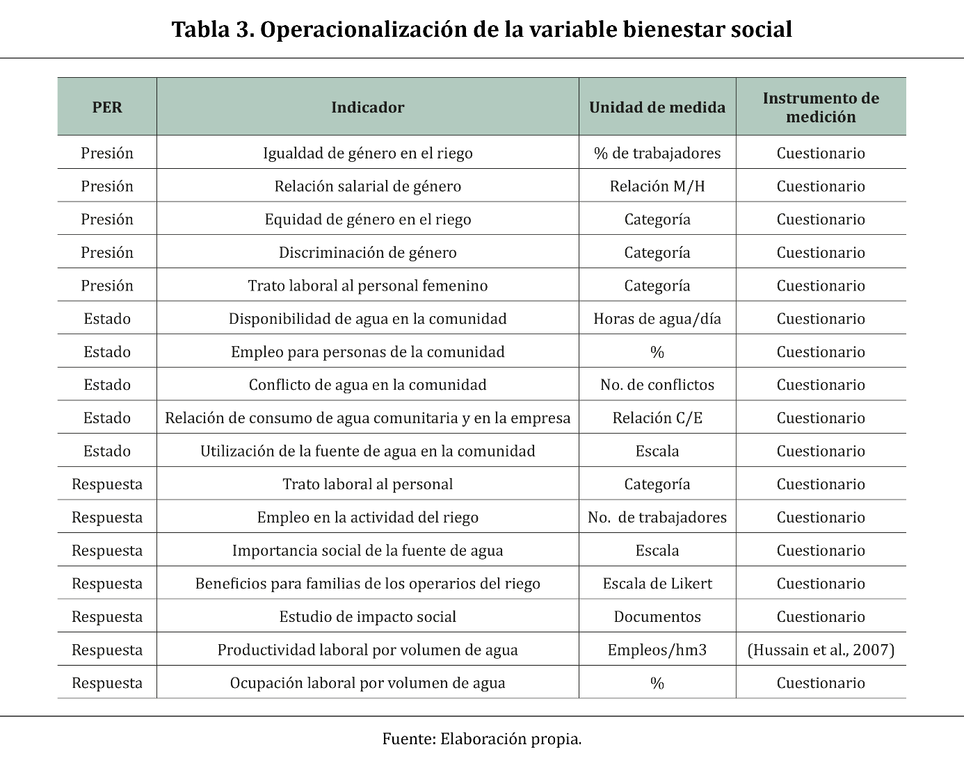 En la Tabla 2 se observa que en la clasificación realizada utilizando el enfoque PER, se establecen 9 indicadores de presión, 5 de estado y 9 de respuesta. En la Tabla 3 se puede apreciar la operacionalización de los indicadores para la variable de bienestar social.