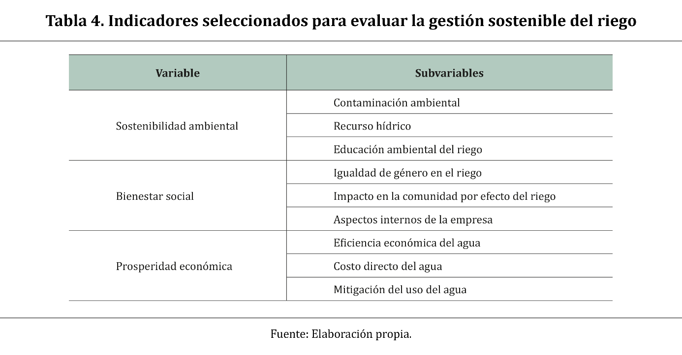 A partir de la revisión de literatura, se elaboraron indicadores con variables y subvariables que incluyen las tres dimensiones de la sostenibilidad (ambiental, bienestar social y prosperidad económica). De esta forma, fue posible evaluar el estado actual de los sistemas de riego en las seis empresas agroexportadoras de papaya seleccionadas. En la Tabla 4 se observan los elementos que relacionan a cada dimensión de la sostenibilidad con sus variables.