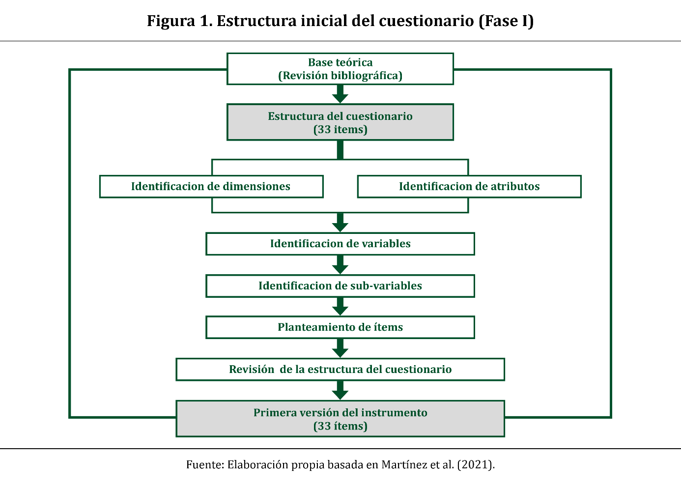 Asimismo, y como señalan Hernández et al. (2014), todo instrumento de recolección de datos debe reunir tres requisitos esenciales: confiabilidad, validez y objetividad. En la Figura 1 se observa el diagrama contextual y sistematizado que se realizó en el diseño del instrumento en la Fase I. En esta fase se desarrolló la versión inicial del instrumento, que contempla 33 ítems estructurados mediante la base teórica bibliográfica consultada y definida para su efecto.