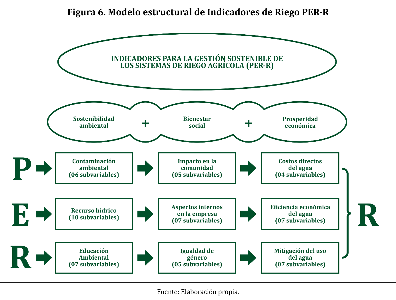 El modelo PER del Riego (PER-R) queda definido con las tres variables de la sostenibilidad y nueve subvariables. En la Figura 6 se aprecia el modelo PER-R como uno de los aportes de la investigación.