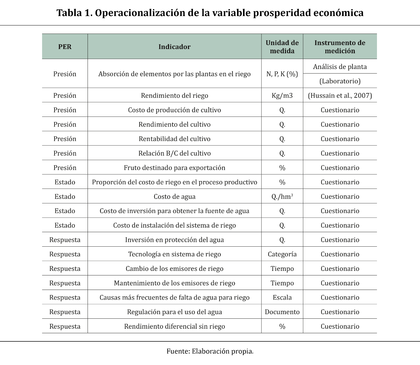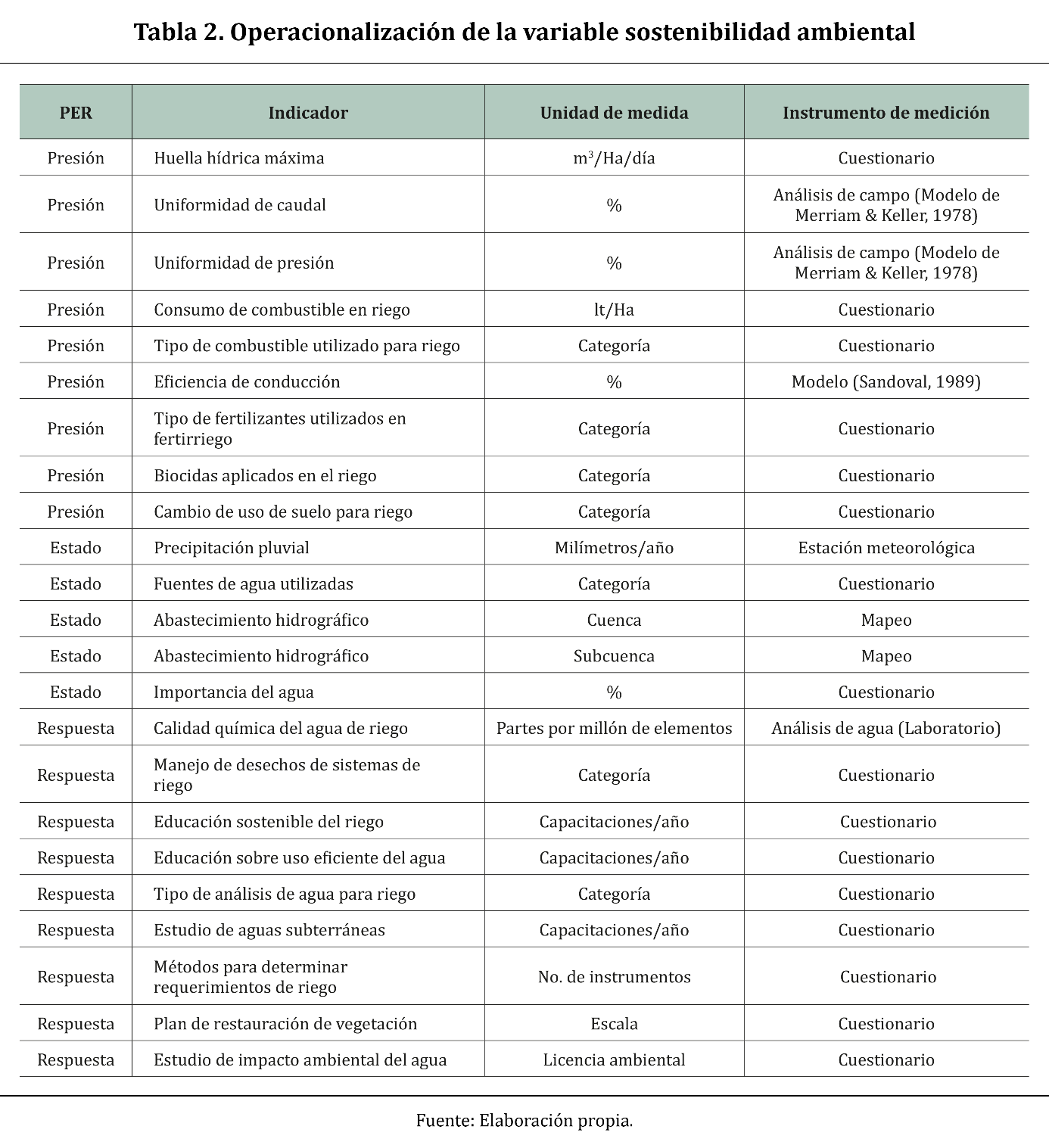 Al clasificar los indicadores para prosperidad económica mediante el enfoque PER, se observa la estructura formada por 7 indicadores de presión, 4 de estado y 7 de respuesta. En la Tabla 2 se muestra la operacionalización de los indicadores de sostenibilidad ambiental.