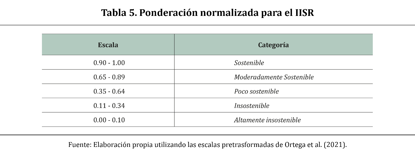 En lo que respecta a la formulación y normalización de las categorías que permiten medir la sostenibilidad, existen diversos estudios realizados (Ibáñez, 2018, p. 16; García, 2018, p. 42; Vázquez, 2017, p. 29; Loaiza et al., 2012, p. 169; Saldívar et al., 2002, p. 176; Constanza, 2000, p. 50), donde se utilizan criterios de clasificación basados en rangos formulados por la Unión Internacional para la Conservación de la Naturaleza (IUCN), el Centro Internacional de Investigación Para el Desarrollo (CIID) o el Programa de las Naciones Unidas para el Desarrollo (PNUD) (1997); los cuales corresponden a escalas de 0.0 a 0.20 (malo o muy bajo), 0.20 a 0.40 (pobre o bajo), 0.40 a 0.60 (intermedio o medio), 0.60 a 0.80 (adecuado o alto) y de 0.80 a 1.00 (bueno o muy alto).