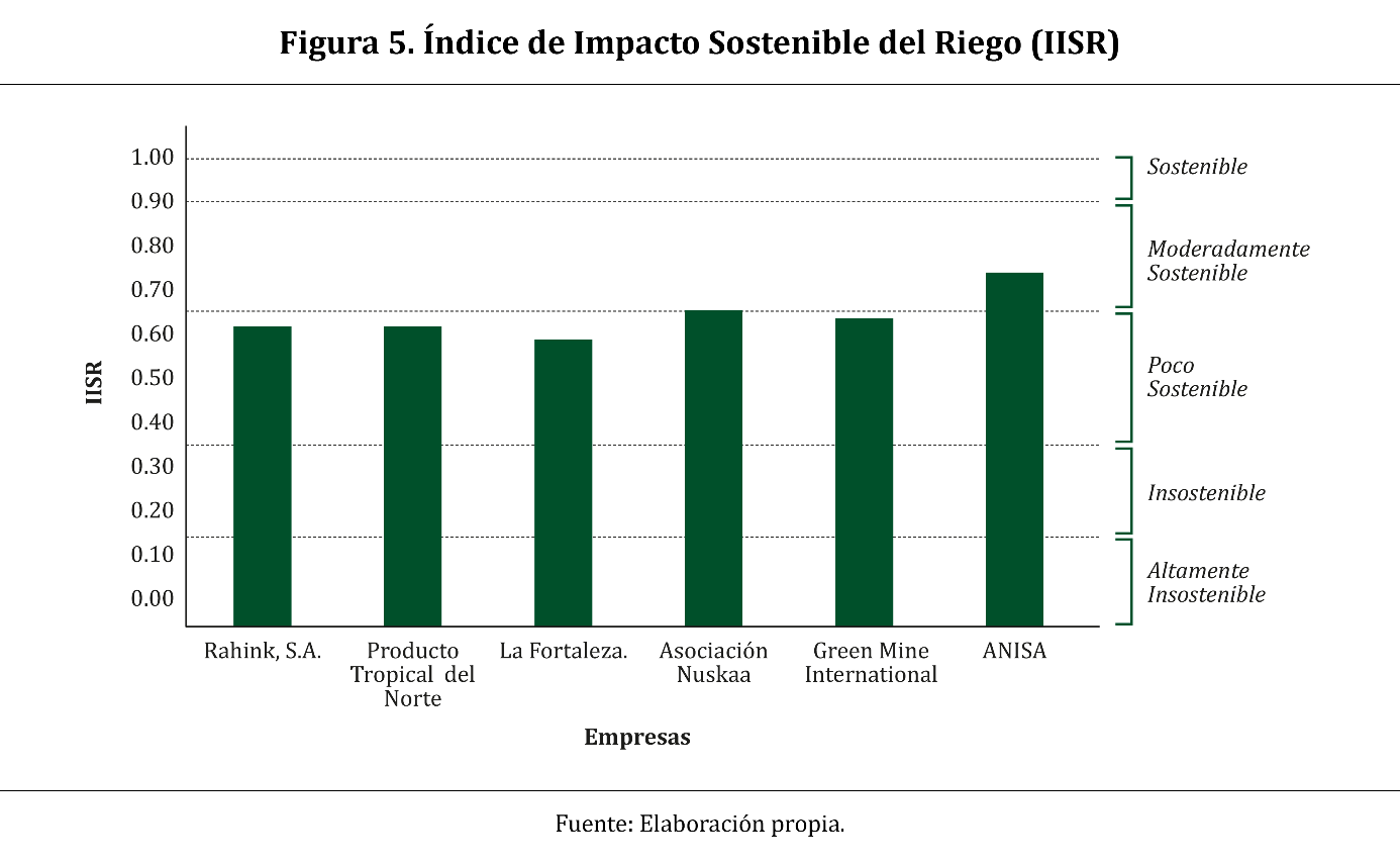 Con la aplicación del modelo Presión-Estado-Respuesta del Riego (PER-R), basado en el IISR, fue posible clasificar a las empresas del estudio en dos grupos según la categoría de los indicadores: las empresas ANISA y Asociación Nuskaa en una categoría de moderadamente sostenible con IISR de 0.70 y 0.65, respectivamente; mientras que las empresas Rahink S.A., Producto Tropical del Norte, La Fortaleza y Green Mine International se localizaron en un grupo clasificado como poco sostenible, con un IISR de 0.62, 0.63, 0.61 y 0.64, respectivamente.
