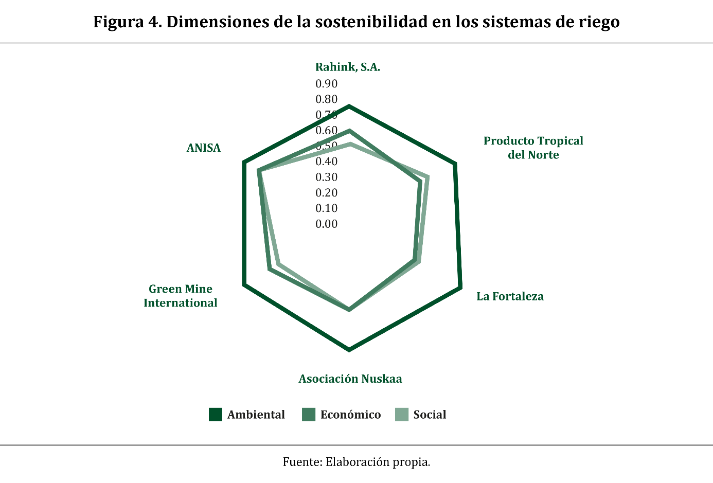 Para el caso de sostenibilidad ambiental, la empresa ANISA presentó superioridad, seguida por la agroexportadora Producto Tropical del Norte. Por último, en la Figura 5 se presenta el Índice de Impacto Sostenible del Riego (IISR), el cual consolida y vincula las tres dimensiones de la sostenibilidad mediante el enfoque del modelo PER-R.