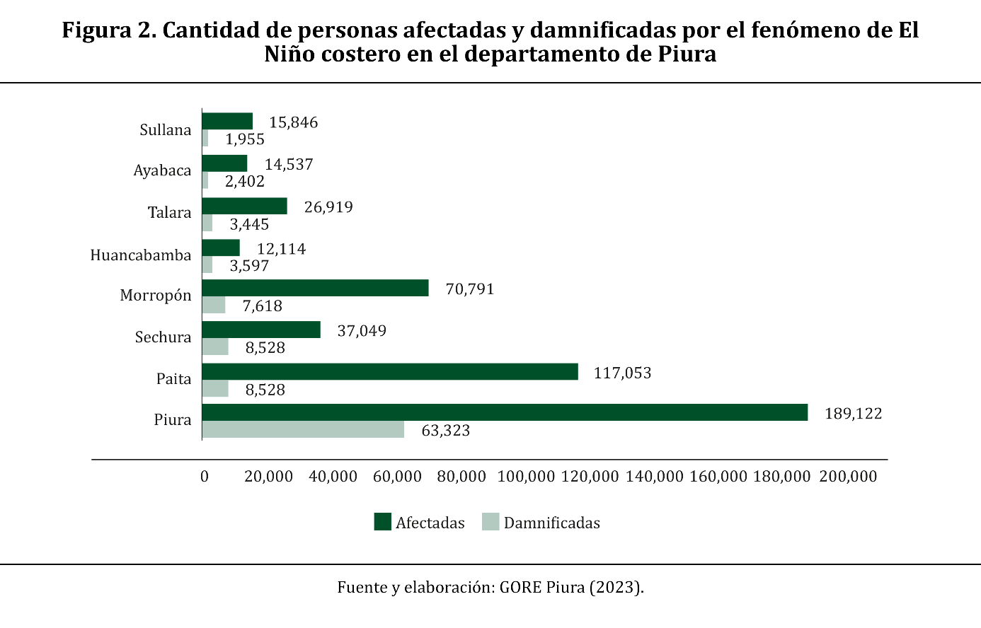 En particular, la provincia de Piura fue una de las zonas más afectadas por el Niño costero, con el mayor número de personas afectadas, alcanzando la cifra de 189 122 habitantes, y el segundo mayor número de personas damnificadas, que llegó a 63 323 habitantes. Estos datos subrayan la necesidad de intensificar las medidas de preparación y respuesta ante desastres naturales en la región. Asimismo, resaltan la importancia de implementar estrategias de mitigación y programas de reconstrucción a largo plazo para reducir el impacto de eventos similares en el futuro (GORE Piura, 2023).