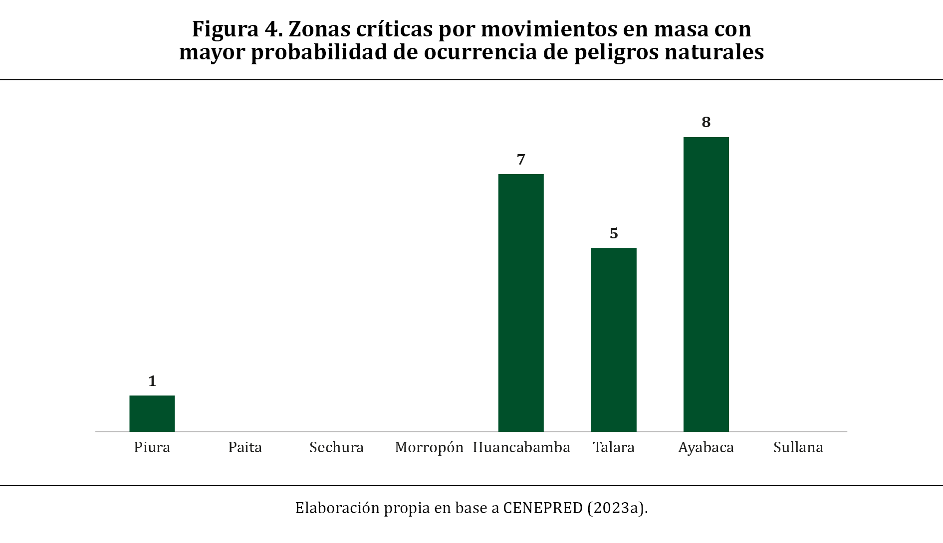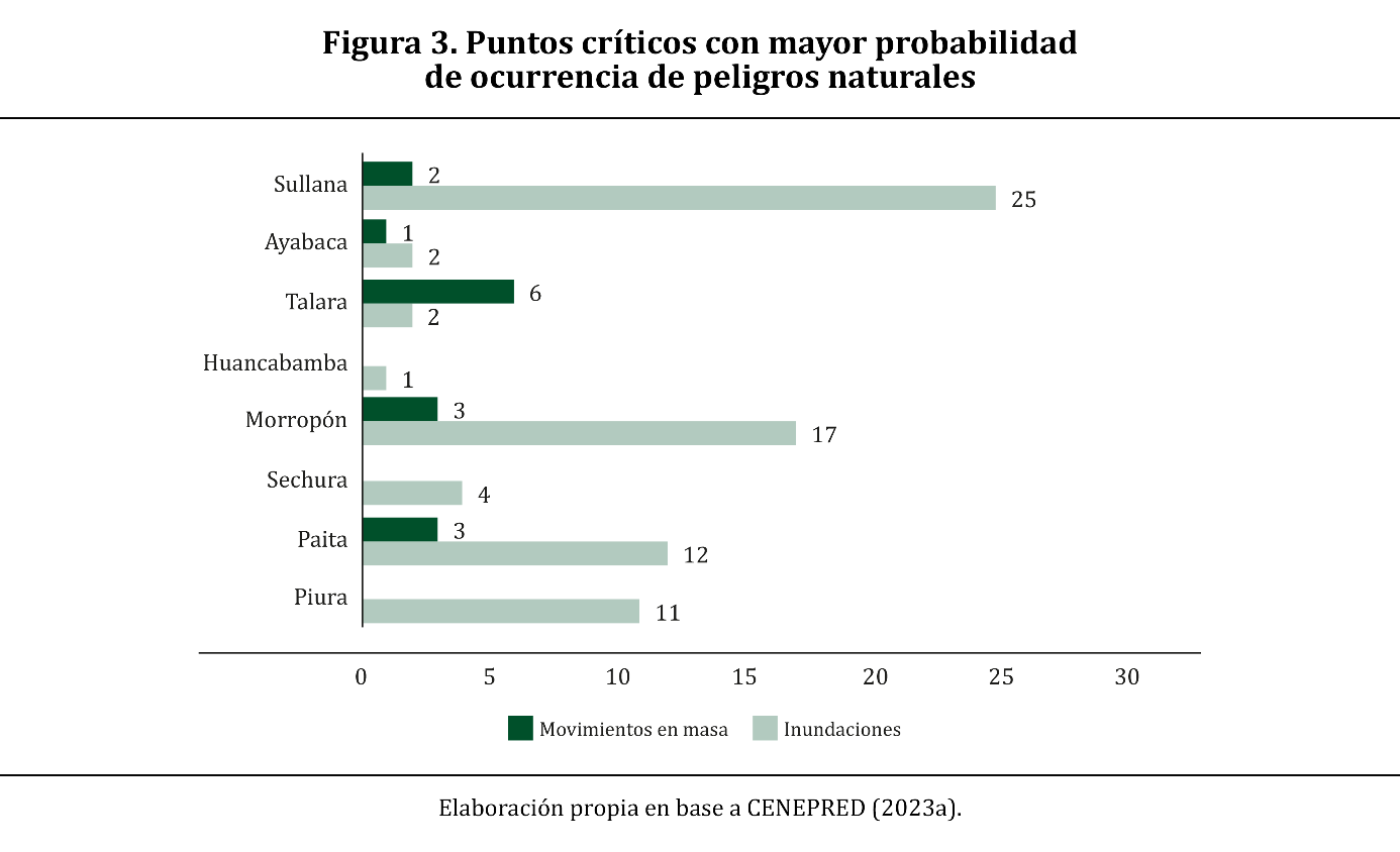 A partir de la información nacional del CENEPRED, sobre escenarios de riesgos asociado a lluvias por el fenómeno de El Niño, se pudo identificar los puntos críticos con mayor probabilidad de ocurrencia de peligros naturales (riesgo alto y muy alto). Teniendo a las provincias de Sullana, Morropón, Paita y Piura con la mayor presencia de puntos críticos por inundaciones, mientras que Talara presenta la mayor cantidad de puntos críticos por movimientos en masa, seguido por Morropón (CENEPRED, 2023a).