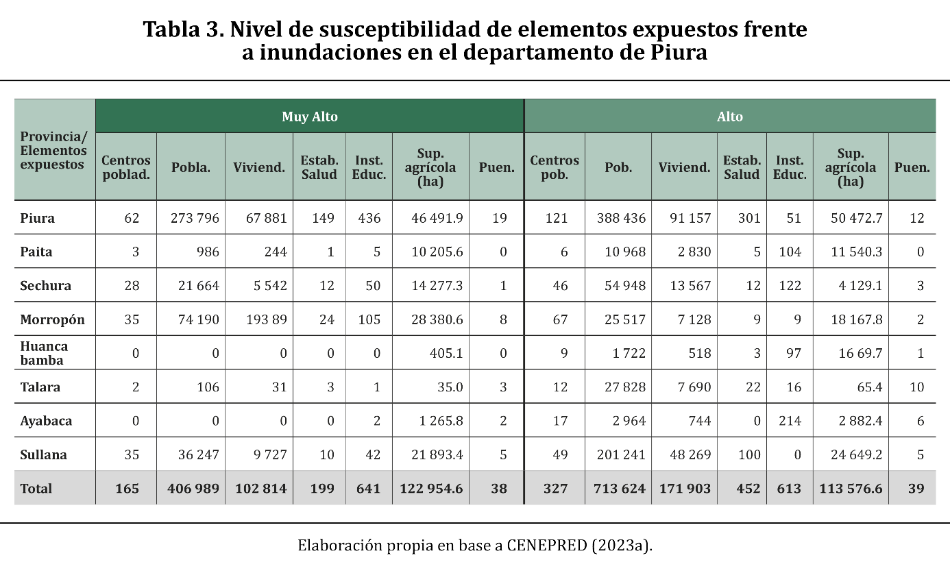 Del mismo modo, se analizaron los elementos expuestos (centros poblados, población, viviendas, entre otras infraestructuras) respecto del nivel de susceptibilidad frente a inundaciones condicionadas por el fenómeno de El Niño para cada provincia. Según los resultados de la tabla 3 (ver más adelante), se puede apreciar que una de las provincias que potencialmente podría verse impactada por la ocurrencia de inundaciones es Piura, tanto en un nivel muy alto y alto de susceptibilidad; le siguen las provincias de Morropón, Sullana y Sechura.