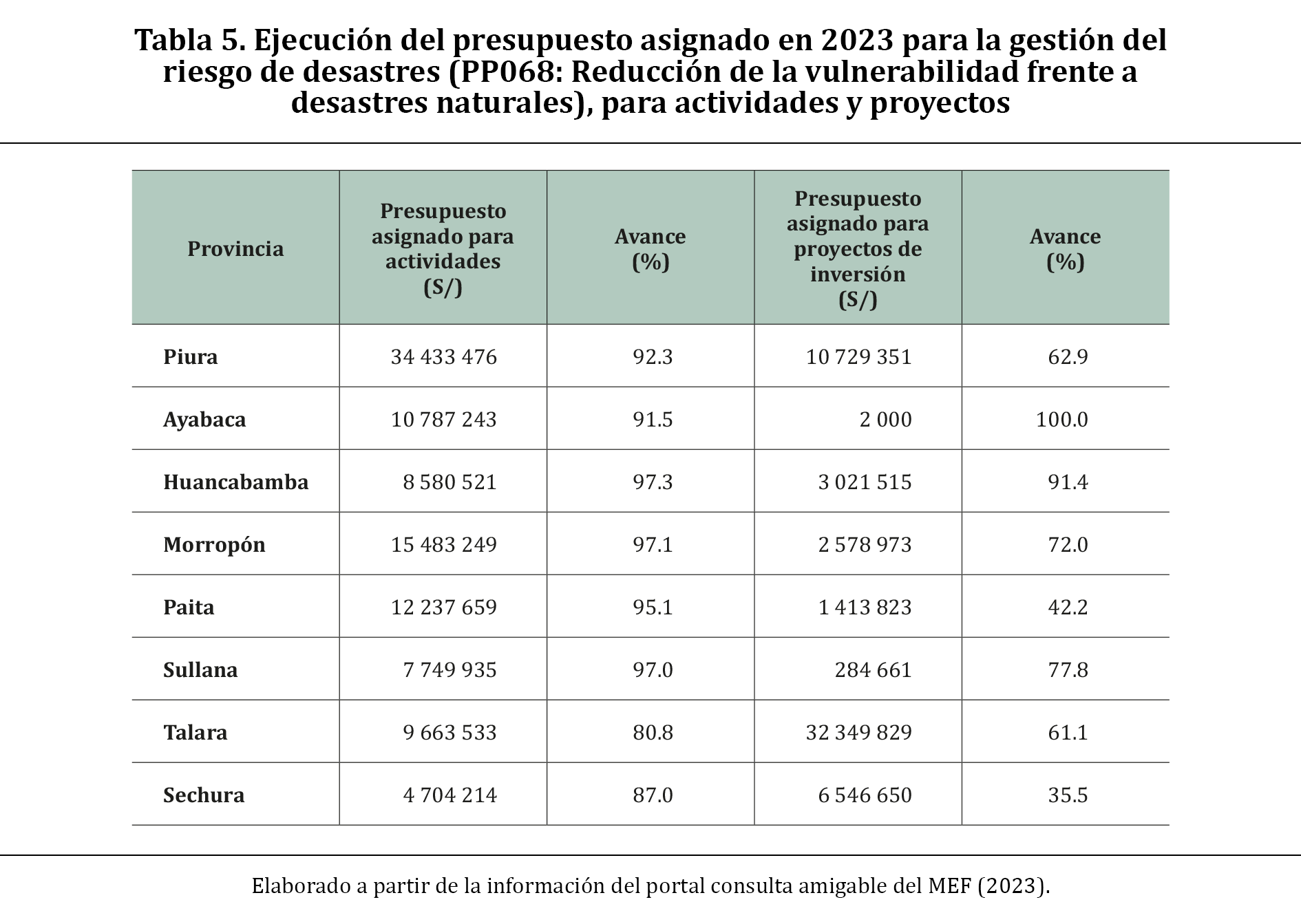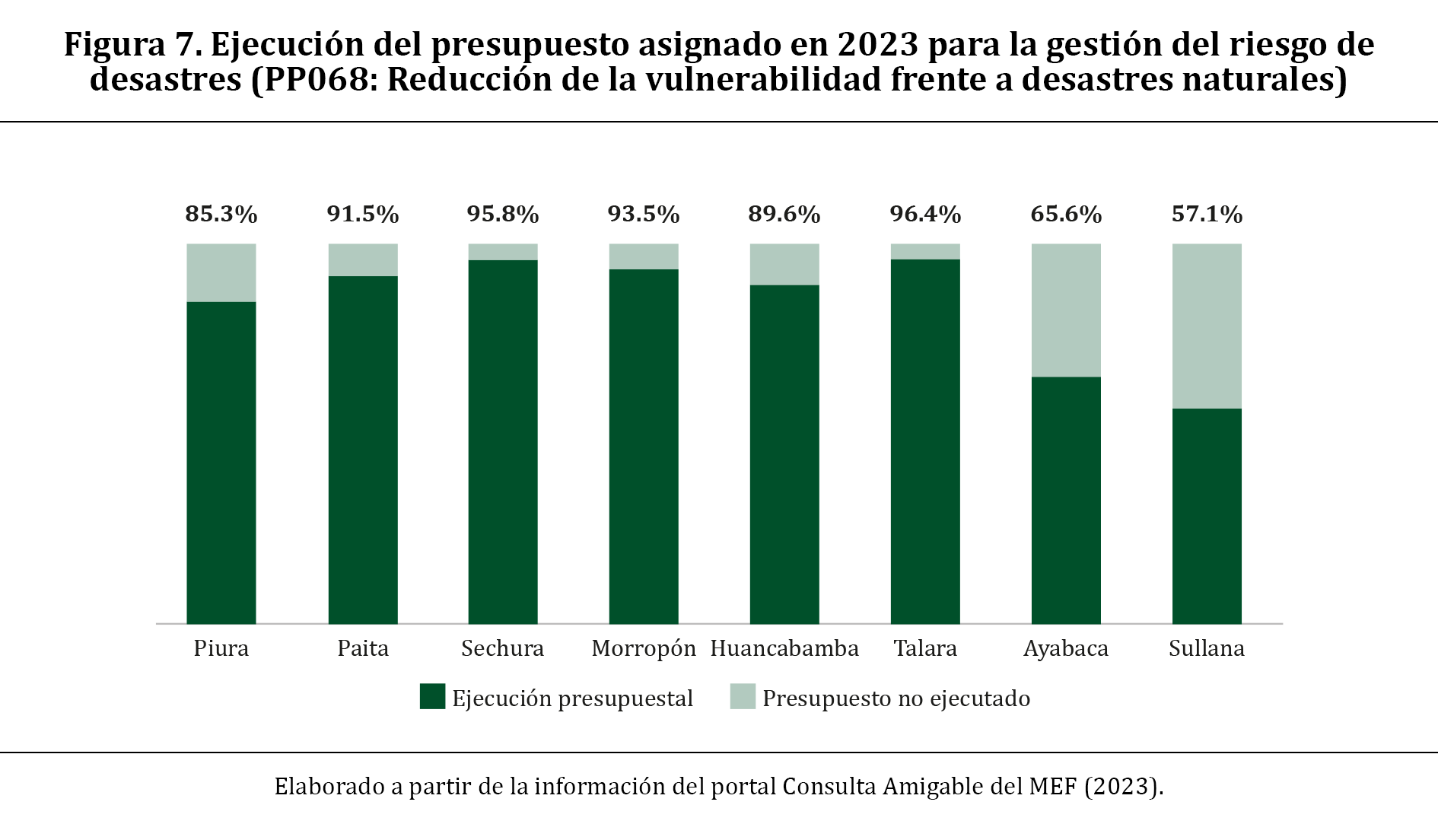 La información obtenida del portal Consulta Amigable del MEF del año 2023 permitió determinar que todas las provincias del departamento de Piura, a excepción de Talara y Sechura, han ejecutado más del 80% de su presupuesto, lo cual pudo incidir en el retraso de la gestión del riesgo de dichas provincias.