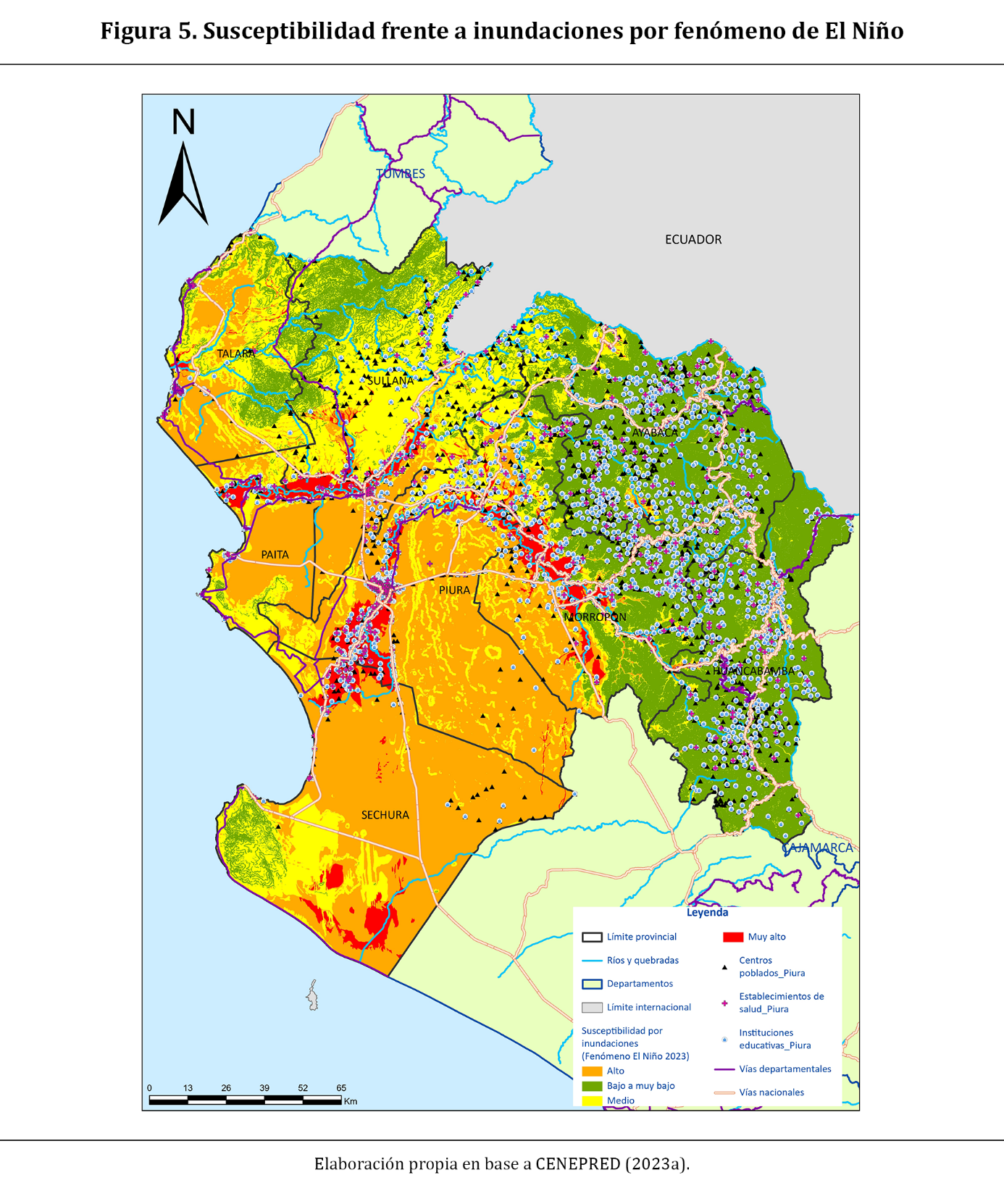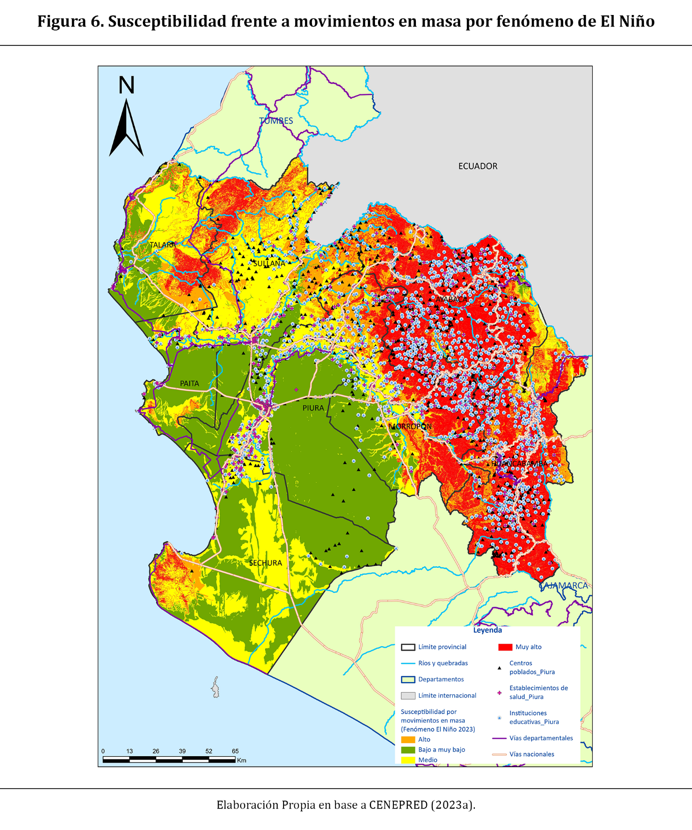 En un escenario de riesgo por inundaciones ante lluvias asociadas al fenómeno de El Niño, las provincias que presentan elementos expuestos (centros poblados, población, viviendas, entre otras infraestructuras) en nivel alto a muy alto de susceptibilidad frente a inundaciones son Piura, Morropón, Sullana y Sechura, mientras que las provincias de Ayabaca y Huancabamba presentan elementos expuestos en nivel alto y muy alto de susceptibilidad ante movimientos en masa.