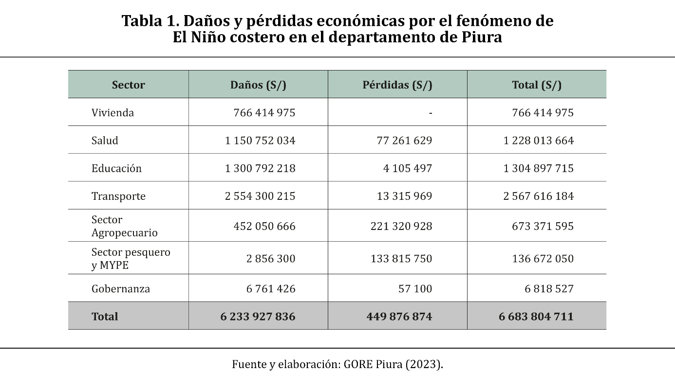 Por otro lado, se pudo evidenciar el impacto sobre el sector económico de Piura, siendo el sector transporte el más afectado en términos de daños económicos, con un total de S/ 2 554 300 215, seguido por el sector educación con S/ 1 300 792 218. El sector salud reportó montos considerables tanto en daños (S/ 1 150 752 034), como en pérdidas (S/ 77 261 629), lo que refleja un impacto significativo. El sector agropecuario fue aquel que presentó más pérdidas, con S/ 221 320 928. En la tabla 1 se explica con mayor detalle los daños y pérdidas por sector económico del departamento de Piura (GORE Piura, 2023).